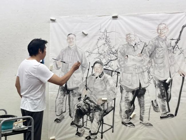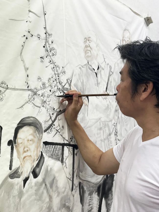 他的创作方式也极为独特——不作草图,即兴挥毫。“我喜欢一种即兴式的创作,一种陌生化的体验感。在画的过程中,当觉得先生是这个动作,应该是这个笔墨的时候,那个瞬间爆发出来的力量,最能彰显写意精神。”这种创作状态让他能够捕捉到最鲜活的艺术瞬间,将内心的情感与灵感毫无保留地倾注于绘画笔法之间。