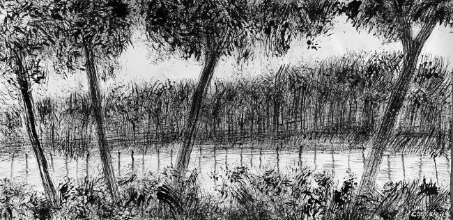 孙静远的笔墨语言藏着传统基因与当代审美的碰撞。他深谙“墨分五色”古训,以积墨为基由淡而浓层层叠加,五六遍乃至八九遍的墨色沉积,如大地年轮般承载草木的厚重质感,暗合“夏山苍翠而欲滴”的古典意境。笔法上将解索皴的灵动与米点皴的温润熔铸一炉,粗笔立田垄筋骨,细笔传草木呼吸,枯笔凝岁月沧桑,湿笔漫盛夏温润,每一笔皆带书法韵律,刚柔相济如禾苗挺拔柔韧。他坚守“简化即风格”,摒弃繁复细节提纯物象核心,以简洁墨色块面构建秩序,却在浓淡变化中暗藏空间层次,让极简画面绽放“无形之大有”的丰盈意蕴。