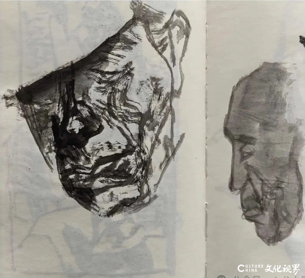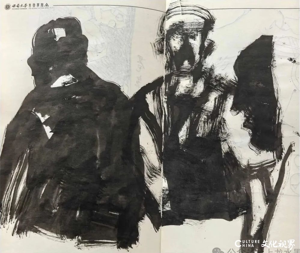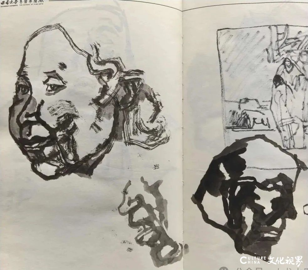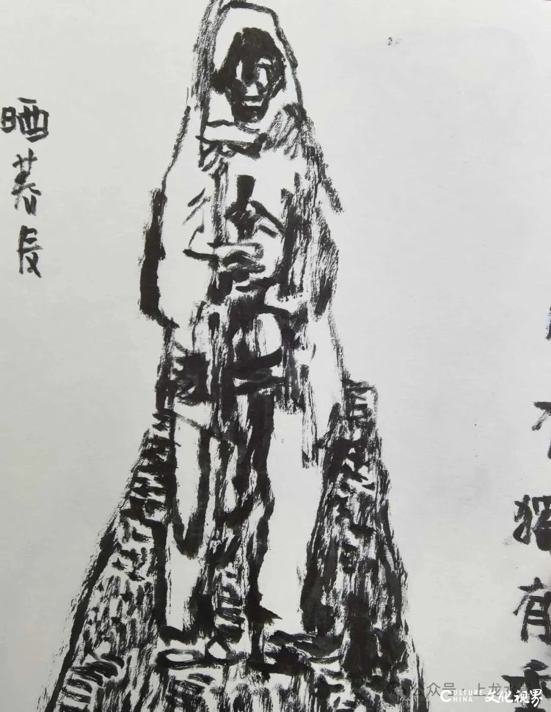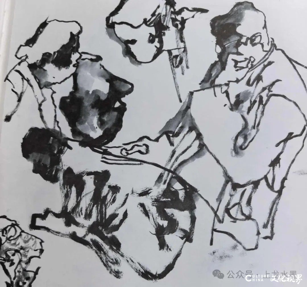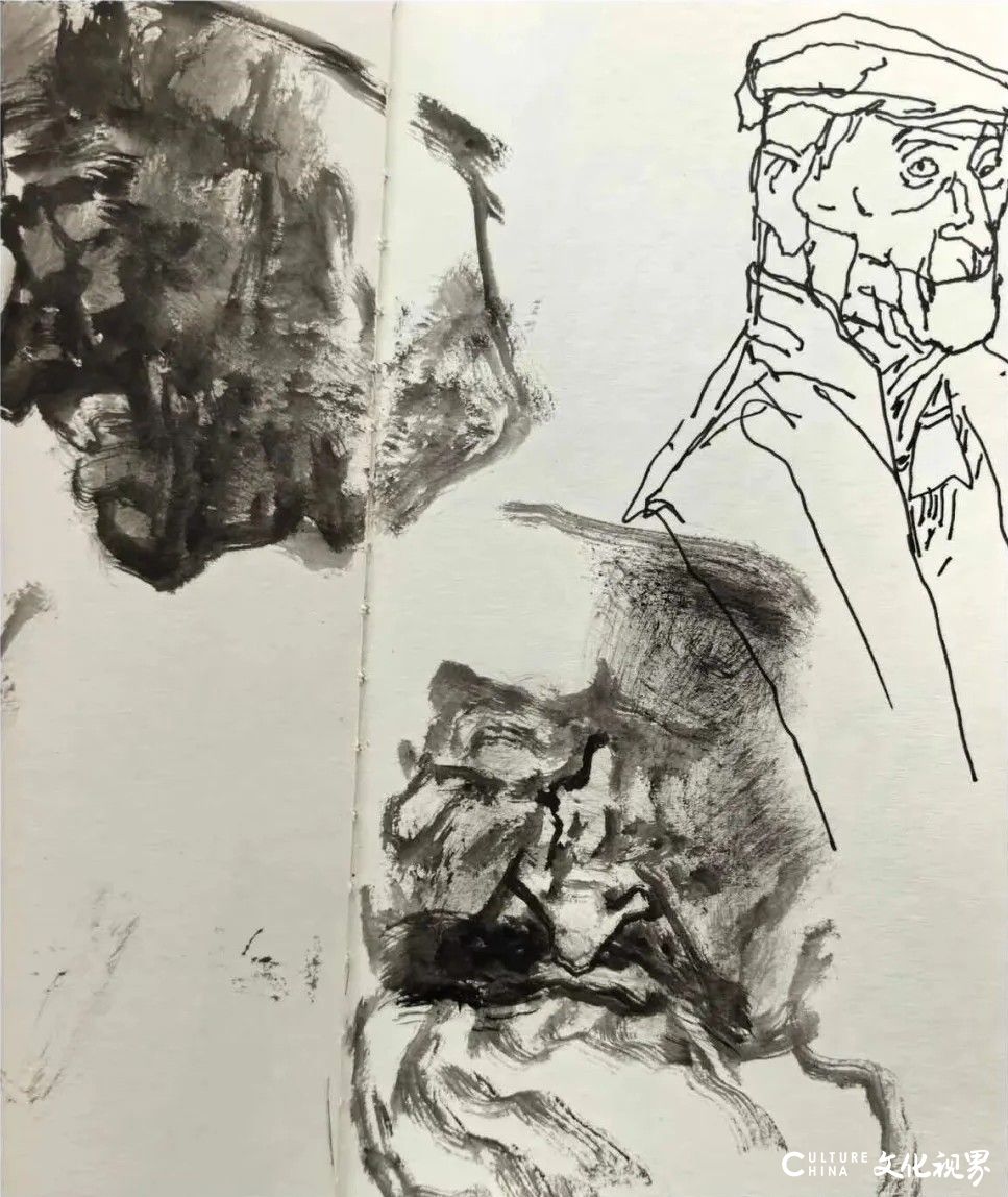 乡间山道上,农家窑洞里,聊天的茶室里,甚至出差的高铁或飞机上,陈老师都会随时随地随手涂抹,有时没纸就用酒店的记事本或单位的稿纸;没笔就拿起茶台上的茶刷画起来……这些速写往往心随手到,情由心出,笔情墨趣,自然天成!