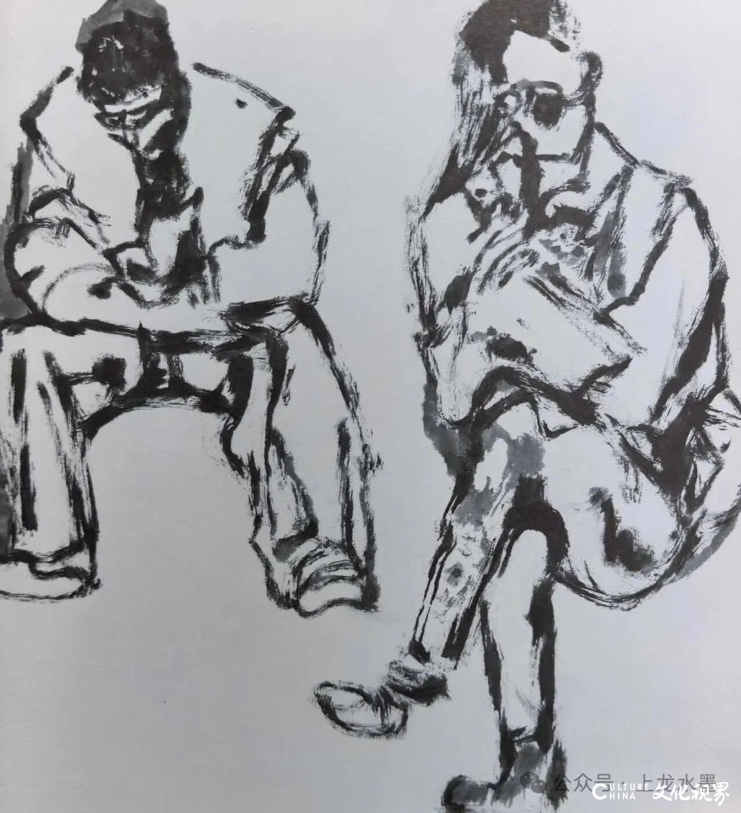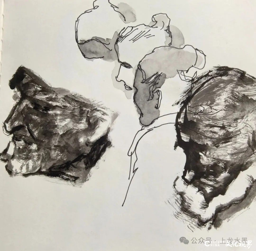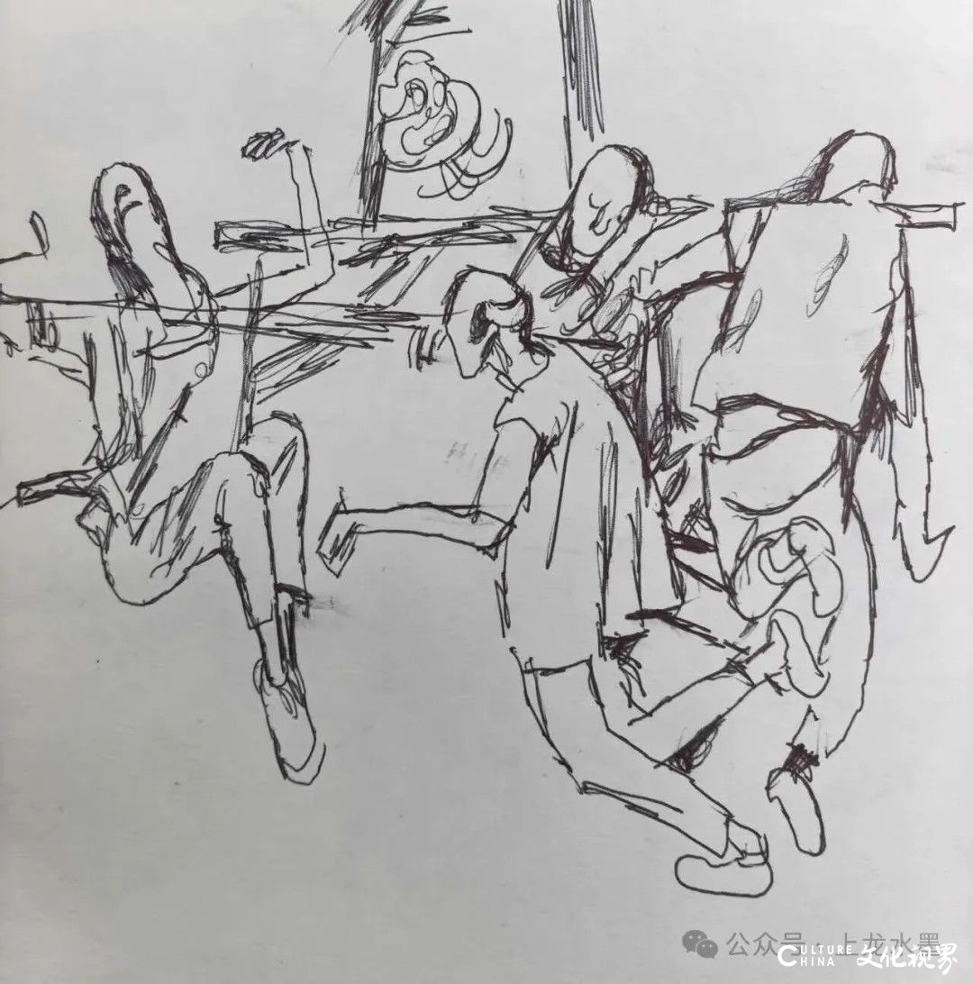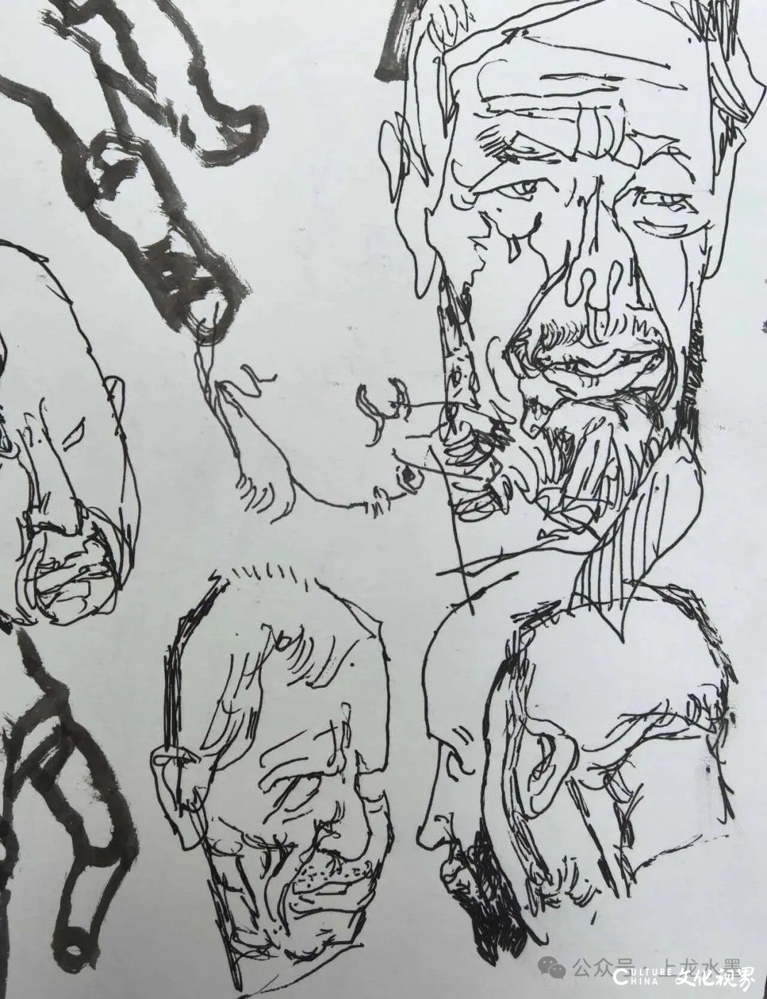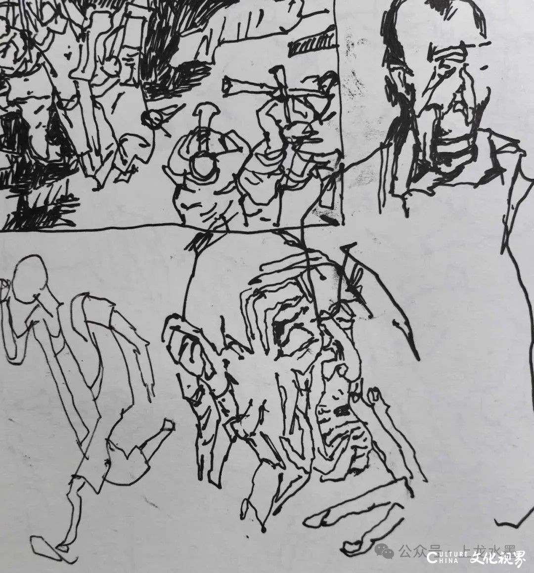 乡间山道上,农家窑洞里,聊天的茶室里,甚至出差的高铁或飞机上,陈老师都会随时随地随手涂抹,有时没纸就用酒店的记事本或单位的稿纸;没笔就拿起茶台上的茶刷画起来……这些速写往往心随手到,情由心出,笔情墨趣,自然天成!