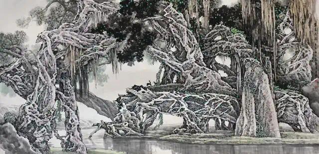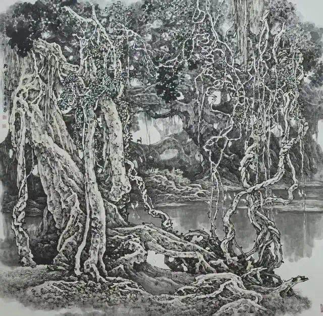 在他创作的《南海魂》《南疆晨辉》《共生》《雨林猿影》《生生不息》等作品中,其海南地域特质尤为鲜明。这是他多年艺术探索后对“瞬间与永恒”这一哲学命题的深刻思考。在巨浪撞击礁石的物理瞬间,墨色由润到枯的微妙渐变,仿佛就是生命轮回的视觉注解;而在刻画礁石与榕树虬根时,他以“铁画银钩”般的刚劲笔触,如凿刻金石,凸显地质的坚硬与生命根系的穿透力;让地质的坚硬与生命的柔韧在对抗中相生相成。这种刚柔相济的笔墨语言,正是海南岛地质结构与生态气质在美学维度上的精妙映照。