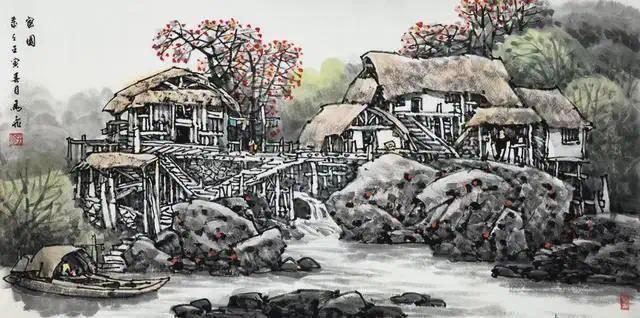 马飞的作品,在意境营造上超越了地域风情的简单叙事,抵达了存在论的诗学高度。而更值得探讨的是马飞对“色墨关系”的现代性重构。他在传统水墨的氤氲气韵中,大胆融入印象派的光色理念,以赭石的暖意与藤黄的明丽,破解热带阳光的视觉密码。这种“色墨共生”的探索,不仅保留了水墨的玄远意境,更赋予画面以灼热的物质存在感,使热带山水的视觉强度获得前所未有的释放。