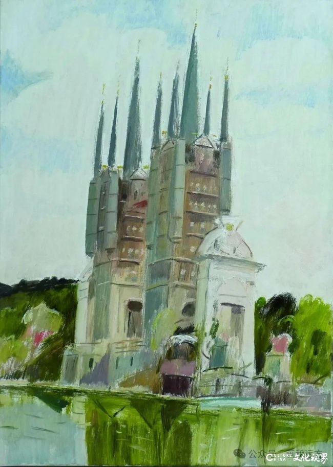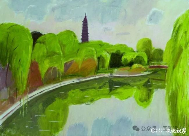 更深层的,是朱春林对“东方意境”的现代性建构。他在油画的空间处理中,暗植中国传统构图的“疏密开合”之理。画面中常有大面积的天空或水面,以简洁的色彩块面形成“留白”,如文人画的“计白当黑”,给观者以无尽的想象纵深。这种对空间的平面化处理,消解了西方透视的强制性,代之以东方美学的“可游可居”之境。他画中的塔影、桥痕、远山,都不再是地理坐标的记录,而是成为承载诗意的符号,如古典诗词中的“意象”,在油彩的语法里唤起观者的文化共鸣。
