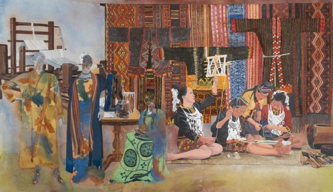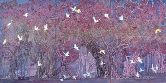 此次入选的七件作品,是海南艺术家深耕本土、锐意创新的集中呈现,每位作者都以独特的艺术语言注入鲜活的生命力。邓鸿飞的《碧海扬帆》聚焦海上帆船运动,流畅线条与明快色彩既再现海南碧海蓝天的自然禀赋,更将自贸港“敢闯敢试、敢为人先”的拼搏精神形象化,壁画语言充满力量感与叙事张力。林理新《和谐家园》、李志雄《南国絮语》与徐凌燕《鹭舞祥林》共同聚焦热带雨林生态:林理新笔触温润,刻画动植物和谐共生图景,传递“生态优先、绿色发展”理念;李志雄以含蓄笔墨勾勒草木生机,彰显人与自然和谐共生的地域特质;徐凌燕用浓艳厚重的色彩铺陈雨林绚烂,恰似自贸港蓬勃向上的发展态势,三件作品从不同维度诠释了“绿水青山就是金山银山”的生态理念。万靓的《南海遗珍》以“海上丝绸之路”古沉船与瓷器为核心意象,通过斑驳质感与厚重色彩展开历史对话,呼应自贸港“对外开放”的时代定位,成为连接古今、沟通中外的文化桥梁。王柯的《璀璨黎锦荟新章》深耕非遗,将黎锦传统纹样与现代艺术语言结合,绚丽视觉既展现非遗魅力,更象征自贸港“传统与现代交融、本土与国际接轨”的文化发展方向,让壁画成为活化传统的创新表达。