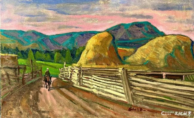 观其草原系列,如《七夕》《围栏》诸作,笔底自有千顷波澜。那山峦的皴法,非西画之明暗,却含国画之骨力,以浓淡不一的油彩叠嶂,似斧劈又似披麻,将草原的雄浑与苍劲揉入肌理。草色之绿,层次万千,或嫩黄带露,或深翠凝烟,是晨光里的鲜活,亦是暮色中的沉郁。牧马者身形简括,却气韵生动,或策骑徐行,或驻马遥望,人与马的轮廓在色彩的晕染中与天地相融,无丝毫刻意,恰如“天人合一”之古意,于油画的材质中绽放出东方哲学的光辉。那林间的光影,不是刻板的焦点透视,而是如宋画山水般的“可游可居”,观者目光所及,或循小径探幽,或随流云观山,心之所向,画之所达。