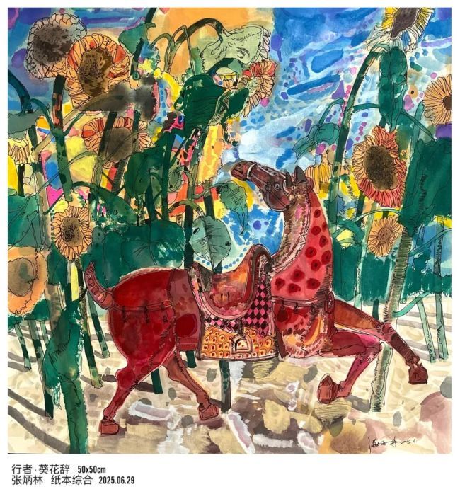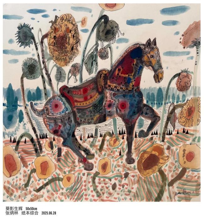 这两年来总想创作出惊世骇俗之作,但每当拿起笔又提出各种问题推翻自己当下的想法,以至于自己陷入迷茫和混乱,很多时候索性不去想要画什么,先让颜色涂抹于画面上,乱着乱着便能寻找出一种感觉将所有的色块和线条串联起来,成为一种无声的曲调,这也让我不由自主地走向了更加自由的表达方式中,当一抹抹颜色跃然纸上晕染散开的一瞬间,就为我无处安放的情绪找到了流淌的河床。在创作中,我允许自己迟疑、犯错、推翻重来——那些在生活中不被接纳的不完美,在画面上却成了独特的笔触;那些无处诉说的焦虑与悲伤,通过色彩的层层覆盖得以转化和释放。