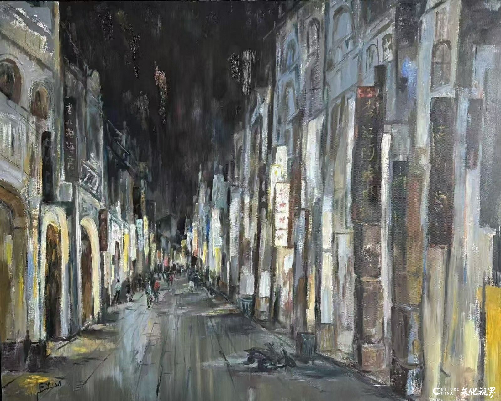 他的艺术基因里,嵌着东北的爽朗、西北的厚重与广西的灵秀。北部湾的海滨图景中,大笔触的粗犷如西北高原的风,蓝灰的晕染似漓江的烟雨,这种“双重性”是他生命历程的视觉投射:北方的筋骨与南方的气韵在油彩皴擦中熔铸,让每一处海滨景致都成了文化杂交的生动样本。夜色老街的明暗交错里,深灰与暖黄的碰撞既是空间纵深感的营造,更是对岭南骑楼“晴雨皆朦胧”的精神归档,那些斑驳的建筑立面,在他笔下成了地域记忆的容器,盛着过往的喧嚣与当下的静谧。