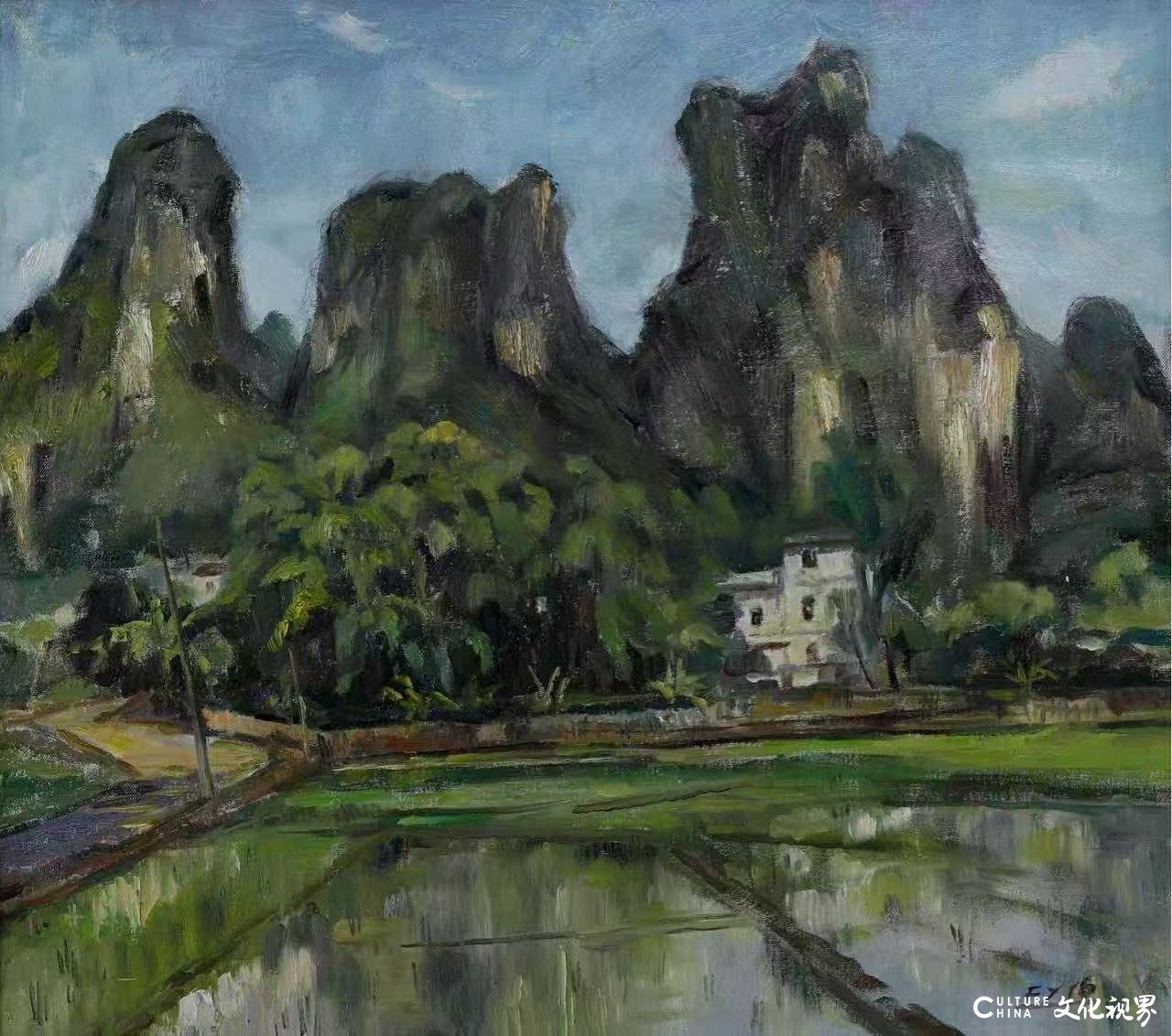 创作于他,是精神建构的修行。古镇小巷的灰白墙垣、静物的时光碎屑、教堂与木雕的文化对话,都在松动的笔触里显露出“生长性”。他不追求物象的复刻,而是以油彩的层叠捕捉知觉的瞬间,让每一次笔触的落下都成为对当下感悟的定格。漓江山水的空灵意境、西北丹霞的雄浑壮阔,在他的笔下并非地理的简单摹写,而是“自我与自然对话的生命肌理”,在粗犷与清雅的张力间,完成了对地域身份的精神确认。