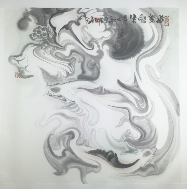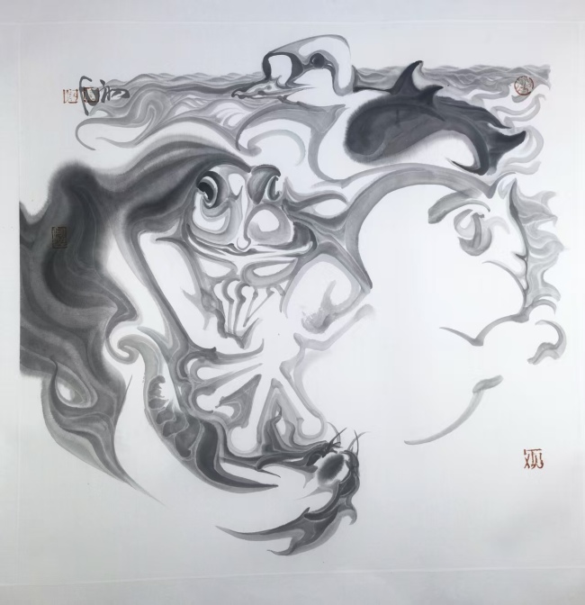 画面中,物象以一种有机的方式共生,却并非简单的组合拼接。他以云气、墨韵为纽带,让不同形态的生命在画面中达成和谐共振,消解了物种与空间的界限。这种共生关系的背后,是对“物我关系”的当代解读——当都市生活将个体分割成独立的孤岛,人对联结的渴望便会自然流露,而艺术正是这种渴望的视觉转化。画面中那些交融的形态,本质上是“人与自我、人与周遭”关系的隐喻。