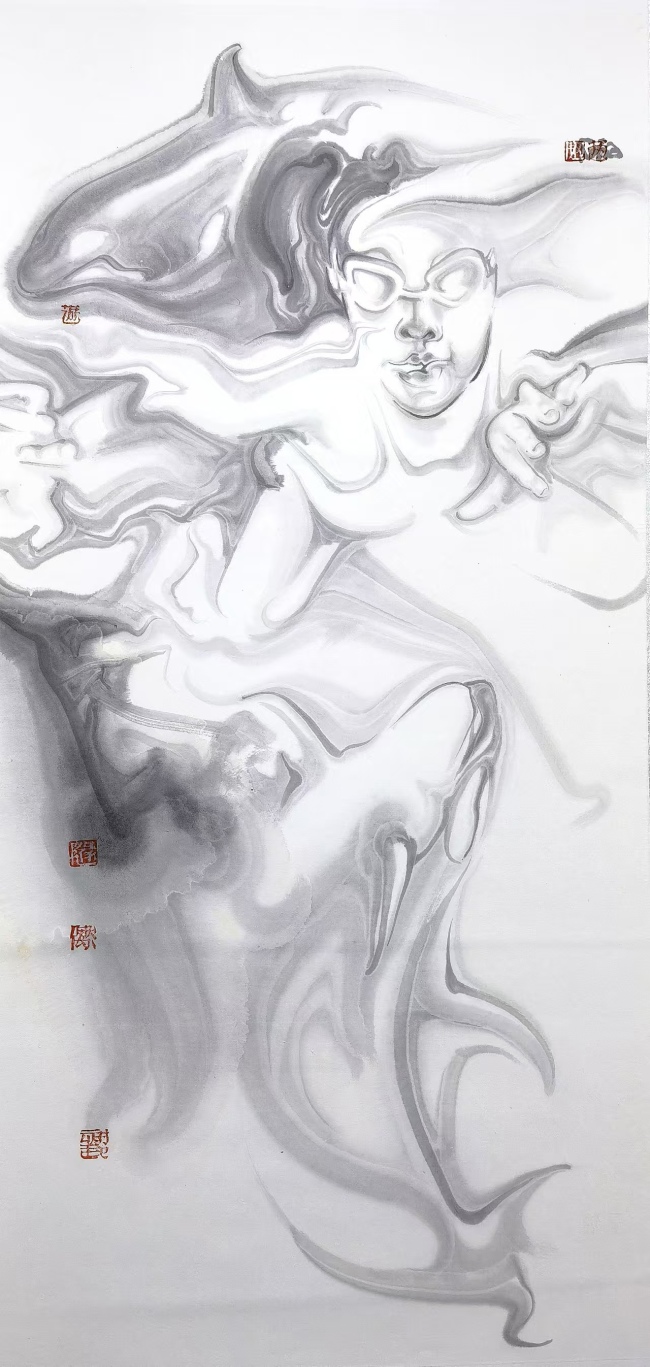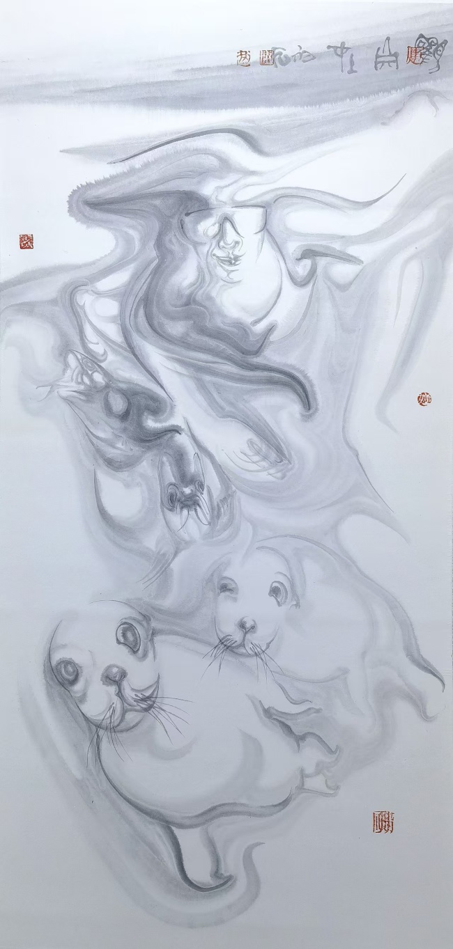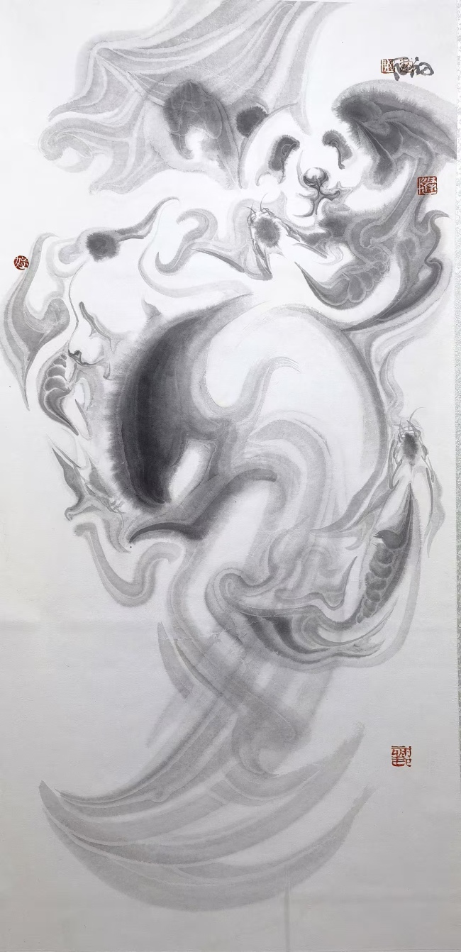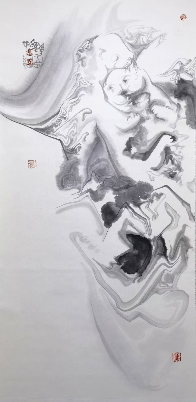 画面中,物象以一种有机的方式共生,却并非简单的组合拼接。他以云气、墨韵为纽带,让不同形态的生命在画面中达成和谐共振,消解了物种与空间的界限。这种共生关系的背后,是对“物我关系”的当代解读——当都市生活将个体分割成独立的孤岛,人对联结的渴望便会自然流露,而艺术正是这种渴望的视觉转化。画面中那些交融的形态,本质上是“人与自我、人与周遭”关系的隐喻。