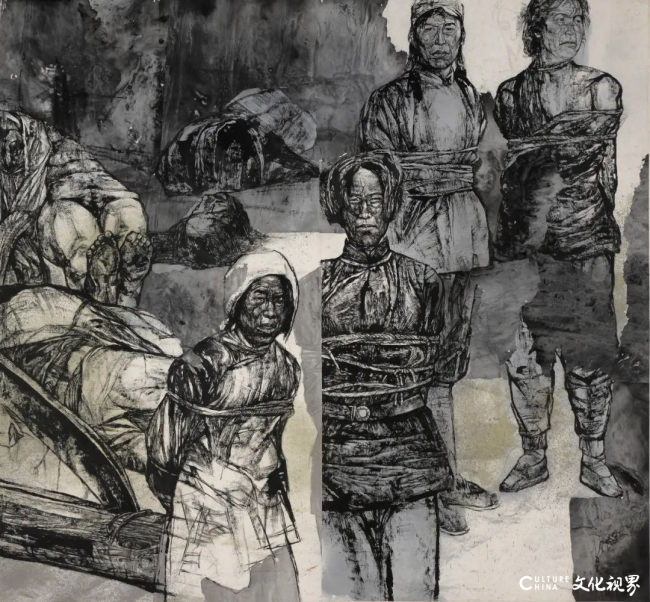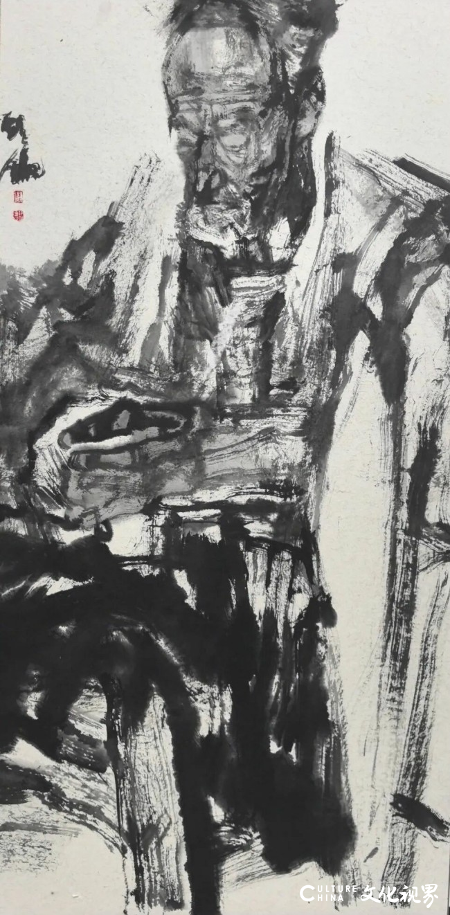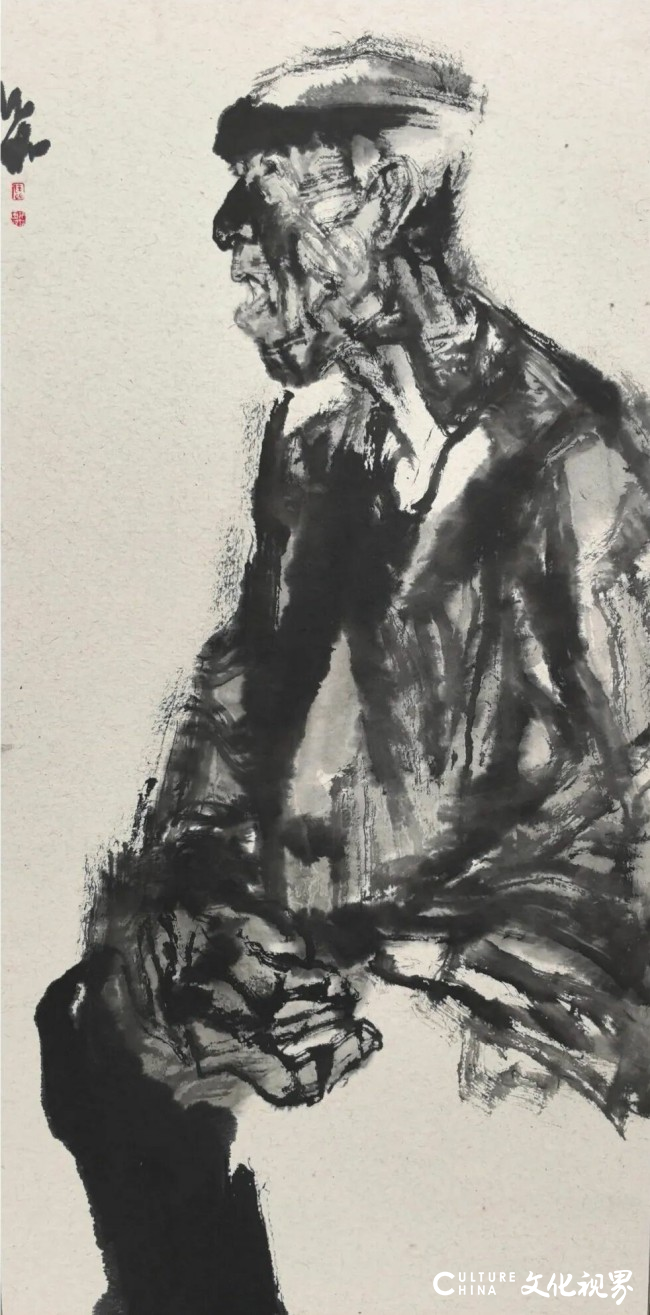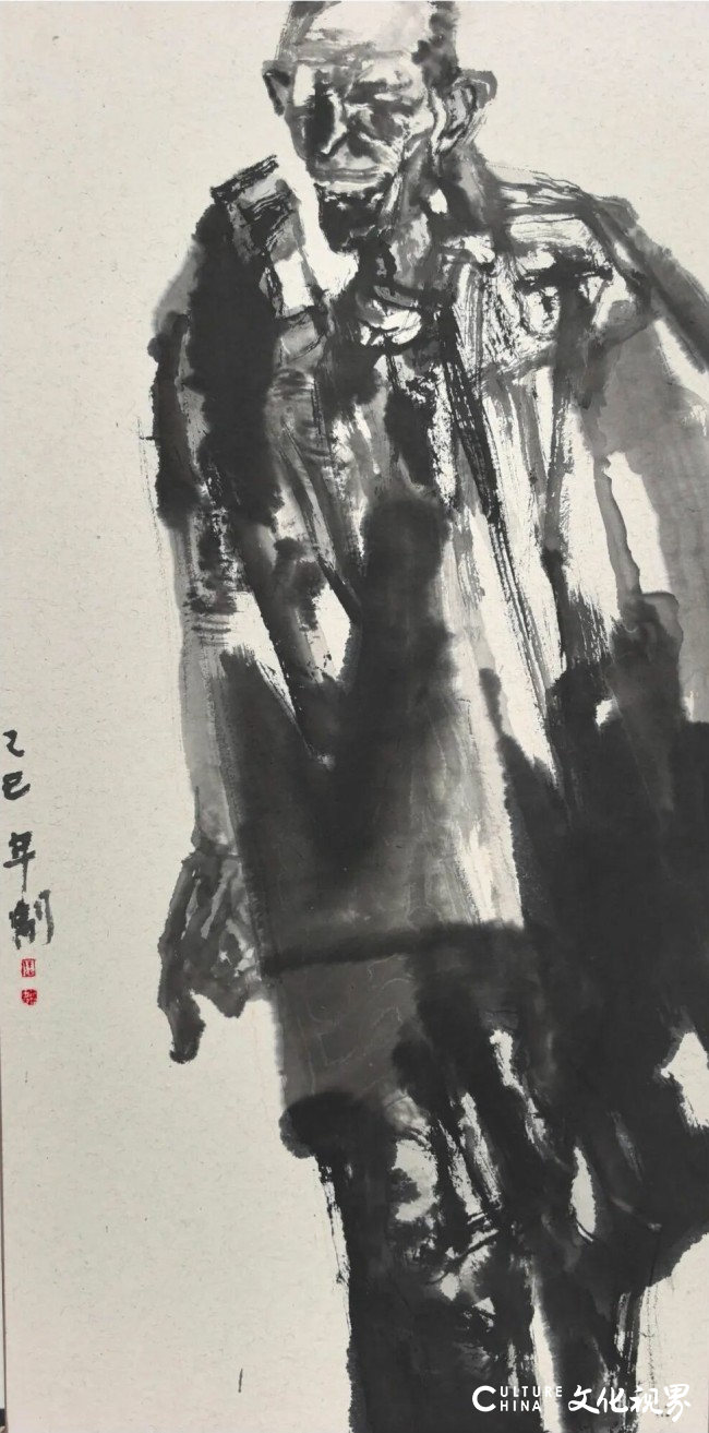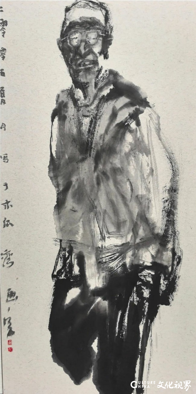 他的作品以写实为根基,却绝非对现实的简单复制——在人物造型上,他精准捕捉神态细节,又巧妙运用适度夸张与变形强化性格特征;在笔墨运用上,他既坚守传统水墨“浓淡干湿”的韵味精髓,又大胆融入现代笔墨语言,让线条或刚劲如铁、或婉转如丝,成为传递情感的有力工具。他始终在思考如何化解写实造型与笔墨韵味、西方经验与民族传统的矛盾,其探索为传统水墨人物画在当代的传承发展提供了宝贵范例。