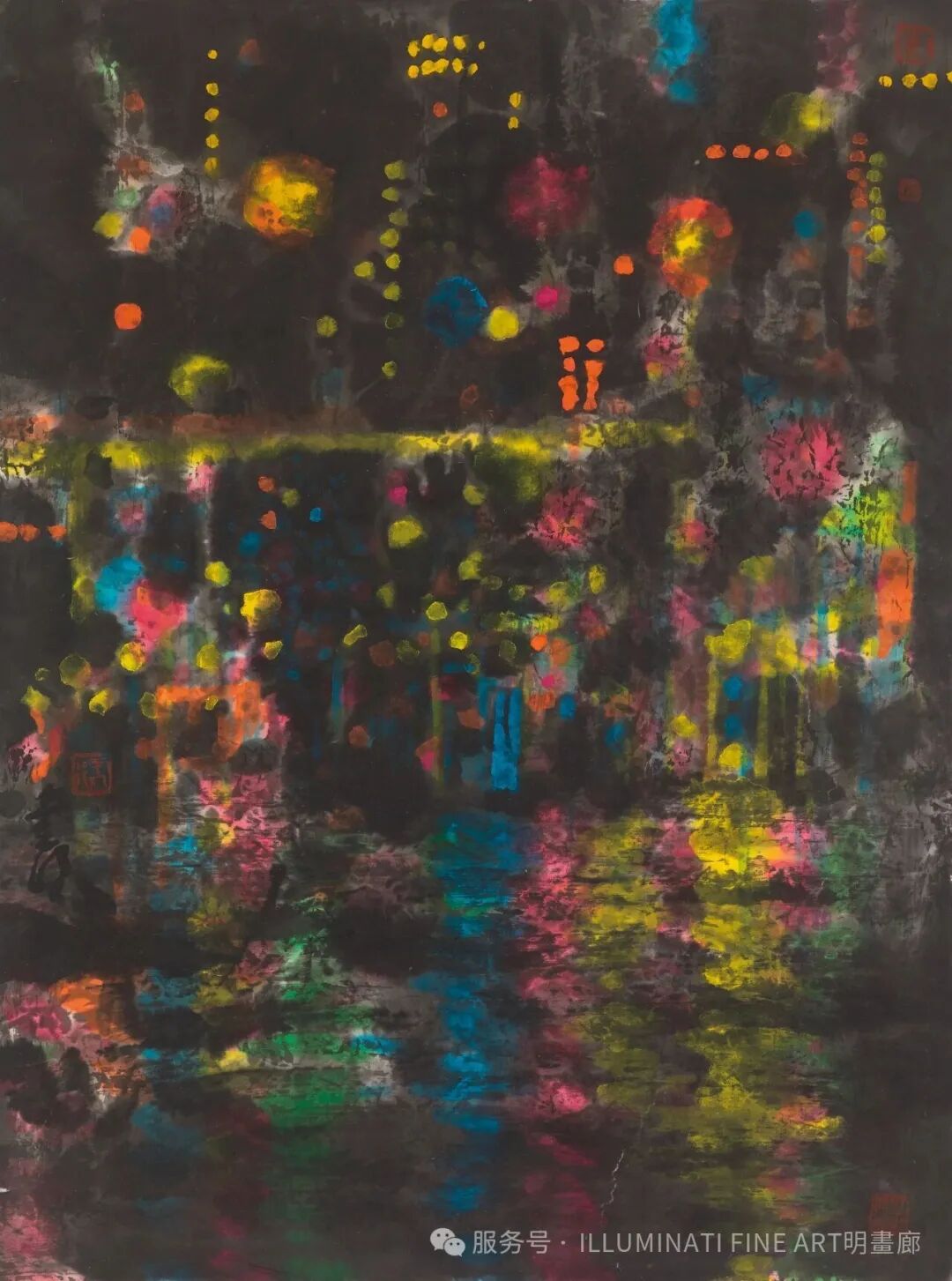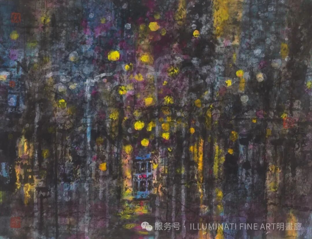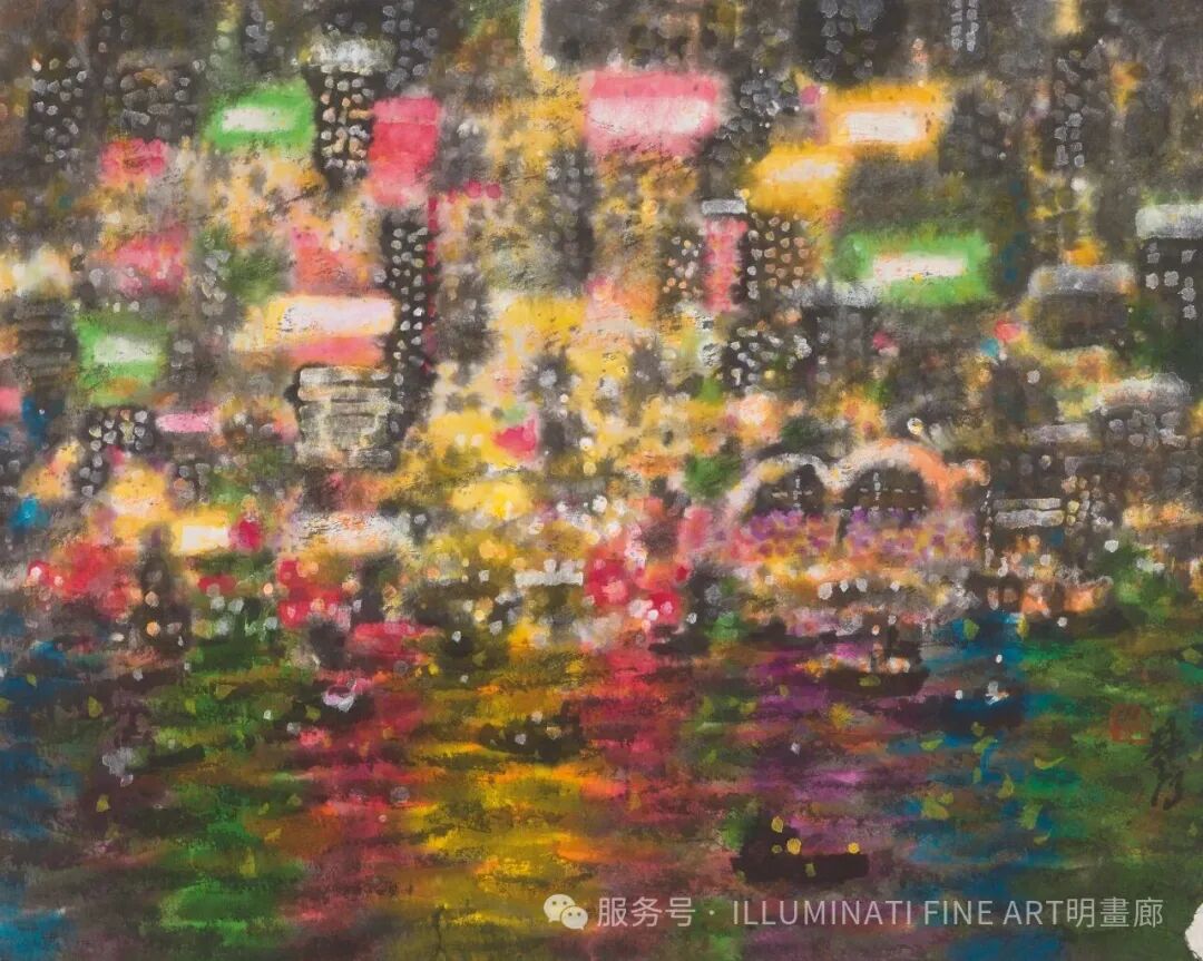 细观艺术家夜景作品,各有千秋:《街灯》(2025年)以墨渲染夜间街道,路灯、交通灯及建筑物的灯光融合,车辆在夜灯下若隐若现;《火树银花》(2025年)描绘香江生气勃勃、烟火璀璨,笔触纵放尽,显都会的繁华热闹。