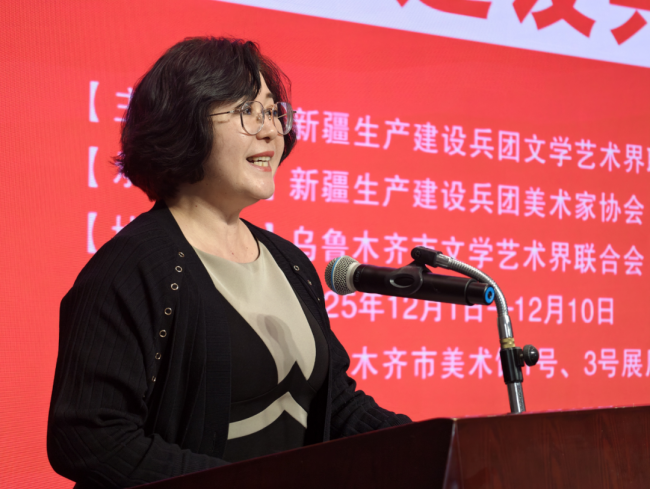 玛尔哈巴·哈斯木在致辞中表示,本次展览既是兵地文艺界从“阶段性携手”迈向“常态化深耕”的鲜活见证,也是“兵地一家亲”的深厚情谊与文化融合的生动实践。