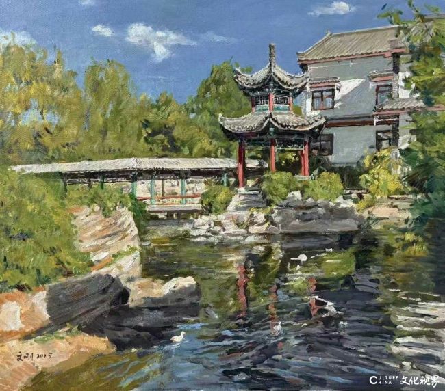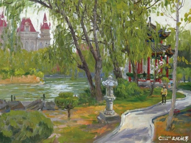 这种“在场感”,藏在他“松而不散”的笔意里。孙文刚的油彩从不是拘于轮廓的复刻,而是带着写意的质感铺陈:柳叶的葱茏是几笔轻快的绿叠起,山石的肌理是色层间自然的皴擦,连建筑的线条都留着笔刷的温度,不刻意平整,却自有朴拙的韵致。他的色彩是“柔化”的——春的嫩青、秋的暖黄、冬的浅灰,都像被时光滤过一层雾,没有尖锐的对比,只有温润的调和,恰如东方美学里“淡墨轻岚”的意境,以油画的媒介,晕出了水墨的清灵。