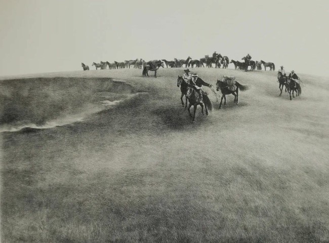 他的版画,以素描为骨血,却又借版画的材质挣脱了纸面的单薄。那些黑与白的对撞,从不是形式的炫技,而是高原本身的气质——大面积的留白是雪野与长天,浓墨般的人物是黑夜里的篝火,咫尺之间,便铺开了“致广大”的空茫,而衣褶的褶皱、牦牛的鬃毛里,又藏着“尽精微”的温度,像牧人掌心的老茧,每一道纹路都裹着生活的重量。