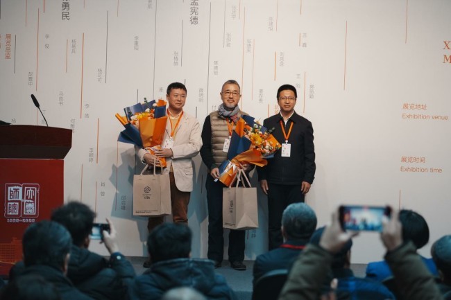 随后,徐勇民教授和孟宪德教授分别发言,分享他们的参展感受与艺术心声。徐勇民教授说道,艺术家应主动思考如何在时代变迁中释放自己的创作空间。希望通过这样的交流,能激发年轻一代在坚守传统内核的同时,勇敢探索绘画艺术在当代的创造性。孟宪德教授谈到作为深耕北方黑土地的艺术创作,蕴含着北方的深厚与辽阔,与南方灵动深邃的水墨作品相遇、碰撞。他期待这场师生联展不仅能展示各自的探索成果,更能促成更深层的学术互鉴。