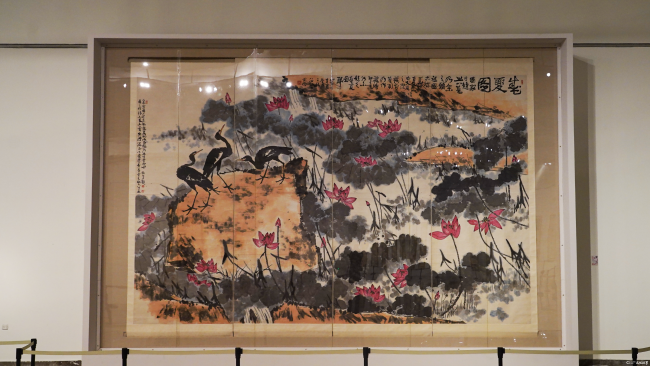 展厅中最引人注目的,是李苦禅晚年时创作的巨幅《盛夏图》。该作面积近22平方米,是中国大写意花鸟画史上首件最大篇幅的艺术巨作。画中荷香漫卷、石韵水润、禽鸟生动,构图开合大气,尽显恢弘气象。先生在画上题词:“国家日趋兴盛乃余之愿,祖国古称华夏,炎夏之际荷花盛开,乃作荷塘即景。”一塘蓬勃向上的荷花,寄托了他深切的赤子情怀与家国理想,也正是其“先有人格,方有画格”艺术理念的鲜活写照。