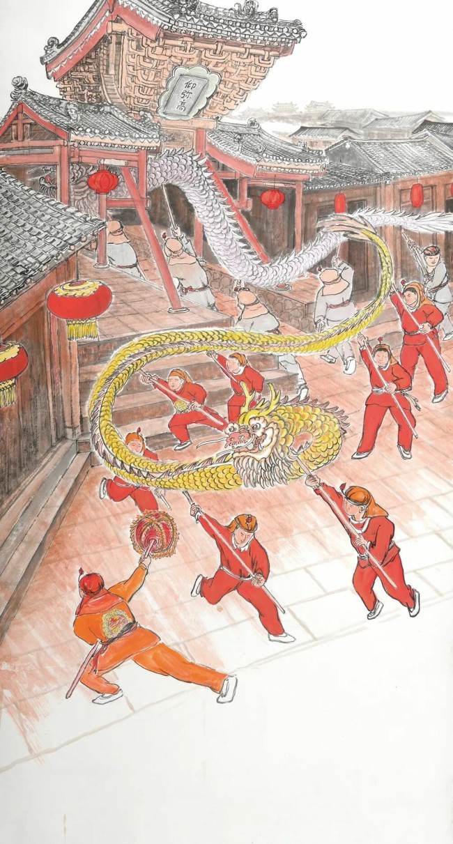 更难得的是,梁宗文在刻画民俗场景时,始终注重挖掘其背后的文化内涵。在陇西,舞龙不仅是春节的娱乐活动,更承载着百姓对风调雨顺的祈愿——龙身的长度、舞龙的路线,都与当地的民俗传承、农耕文化息息相关。在《天门不碍蛟龙跃》中,他将舞龙队伍置于陇西的古老牌坊头天门下,龙身从门洞蜿蜒而出,龙头向着天空昂首,仿佛要冲破云霄;画中的龙鳞以焦墨点描,龙爪则用劲健的线条勾勒,既展现了舞龙的磅礴气势,也暗合了陇西百姓对“龙行雨施”的美好期盼。而《锣鼓催开太平调》里的民间传统秧歌铙子表演,更是陇西民俗中“祈福纳祥”的重要载体:画面中,鼓手们围坐成圈,鼓槌落下时尘土飞扬,围观的百姓拍手叫好,梁宗文用粗犷的线条描绘鼓面的震动,用晕染的墨色表现鼓声的回荡,让观者仿佛能听见那穿越街巷的锣鼓声,也能感受到百姓对“太平盛世”的朴素向往。