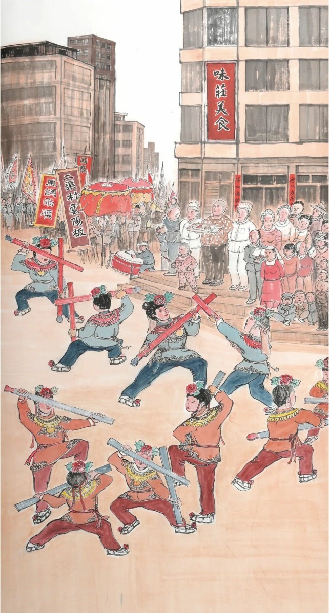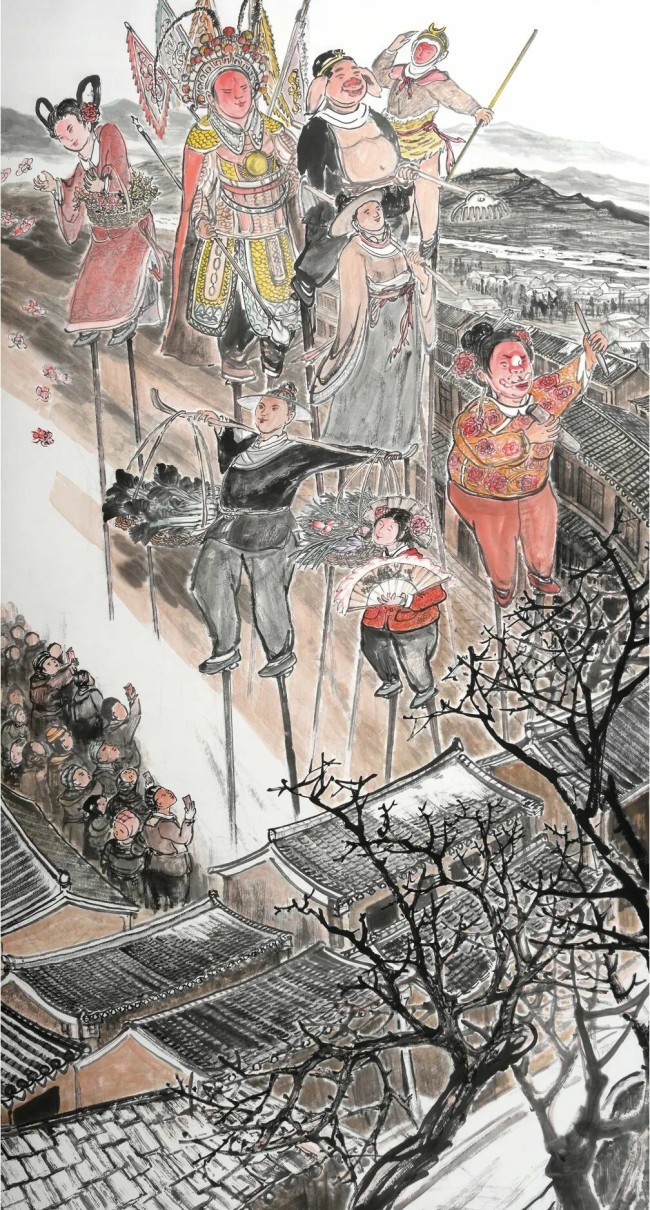 这些根植于民间的文化记忆,在梁宗文的笔下不再是抽象的概念,而是成为可感、可触的艺术形象。他曾说:“画民俗不是画热闹,而是画人心啊!”百姓在民俗活动中寄托的情感,才是民俗文化真正的灵魂。”这份对民俗的深刻理解,让他的作品超越了地域的局限,成为对中华民间文化的一次深情礼赞。