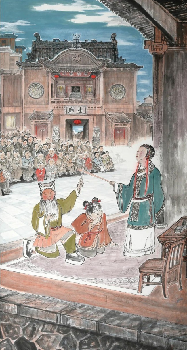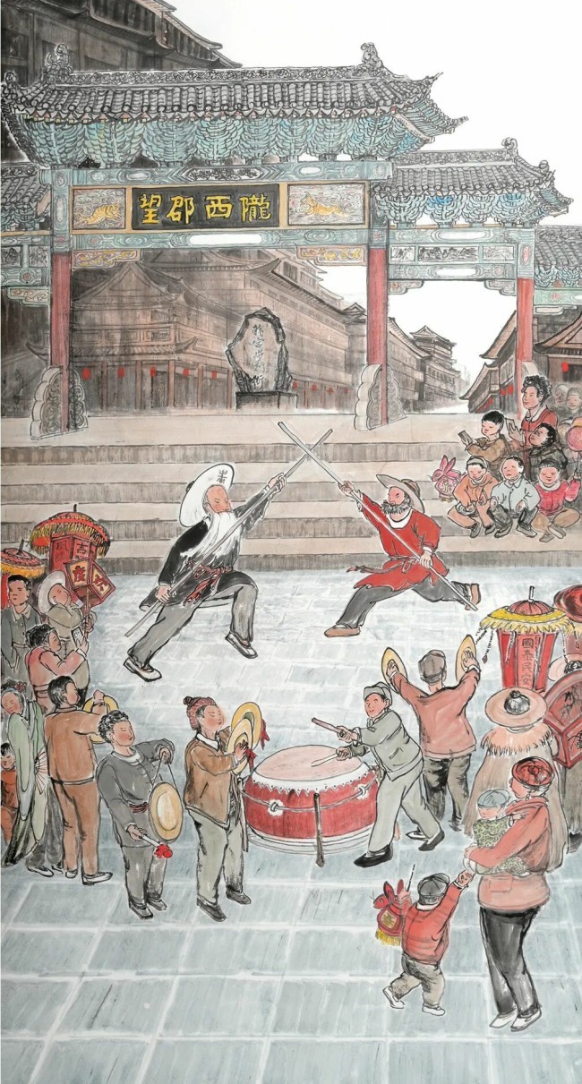 梁宗文的笔墨从不是对历史遗迹的简单复刻,而是以写实与写意相融的手法,让历史“活”在民俗场景中。《古韵今声继良风》描绘了陇西古戏台上的说唱表演,戏台的木柱上刻着明清时期的楹联,字迹虽已模糊,却在他的笔下被赋予了新的生命力;台下的观众有白发苍苍的老者,也有稚气未脱的孩童,不同年龄的人围坐在一起,听着流传百年的曲艺唱段,仿佛时光在此刻停滞。他在创作中深有体会地说:“陇西的历史不是陈列在博物馆里的文物,而是流淌在老百姓生活中的烟火气,民俗就是连接历史与当下的纽带。”正是这份对历史的敬畏与对生活的洞察,让他的作品跳出了“怀古”的狭隘框架,成为对陇西千年文脉的生动诠释。