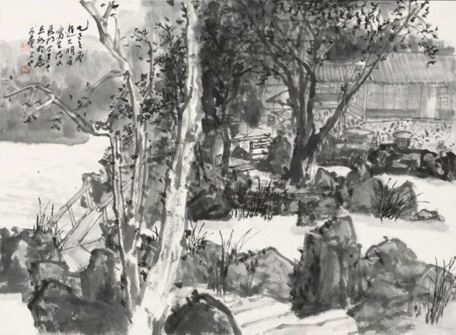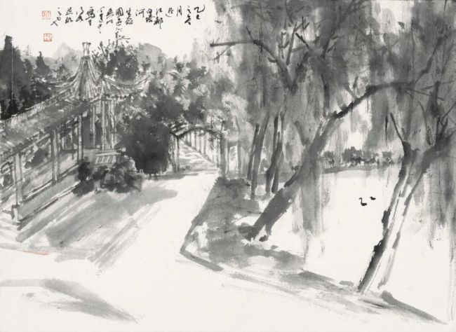 鸿辉浸淫江南园林画境多年,尤钟扬州园林,此地亦是其艺术灵感的源泉所在。他于写生工具素来随性,常席地铺毡,吮墨舔毫,落笔挥洒自如,善用虚笔衬重墨,笔下景致氤氲灵动,生机盎然,自成一格,江湖雅称“园林王子”。