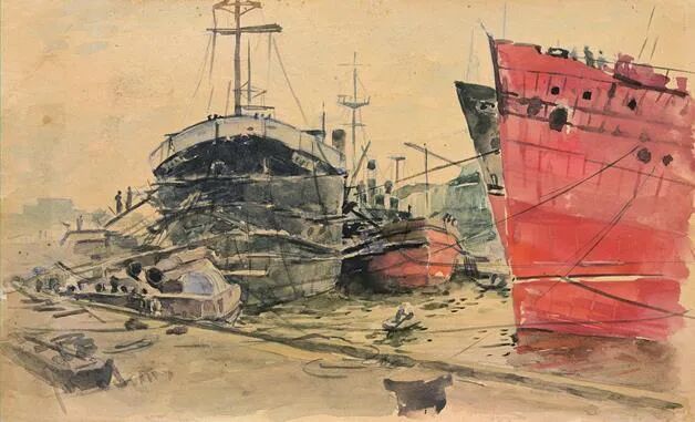 修船厂1957年20×34cm水彩王盛烈
