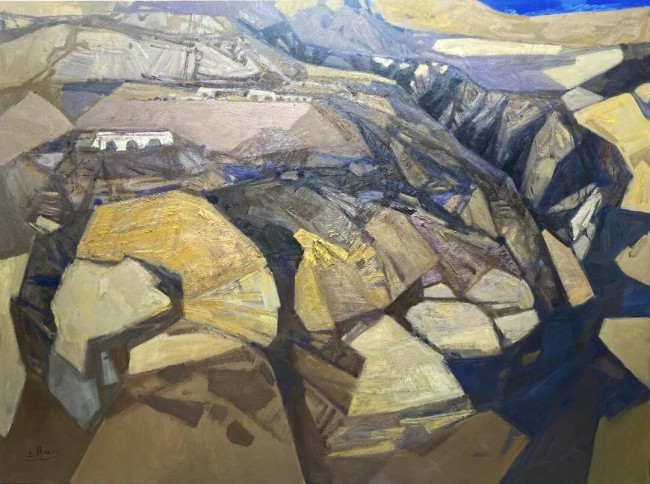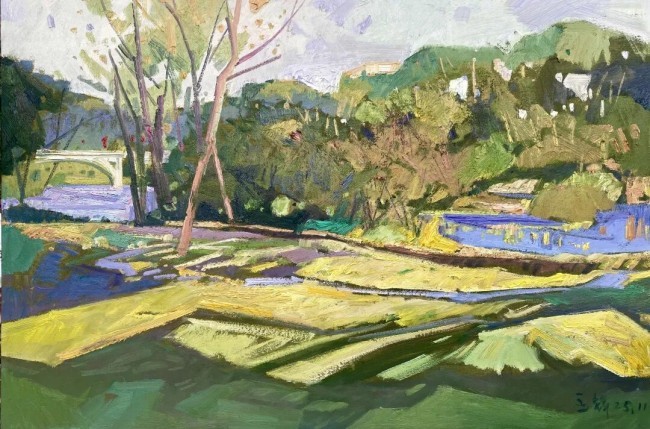 色彩是他笔下的音符,既有着油画本体的厚重交响,又暗合水墨“墨分五色”的韵致。同色系的渐变如丝竹轻吟,铺展出草木的葱郁;补色的碰撞似鼓点骤响,让残阳的冷暖归于和谐,恰如“和而不同”的哲思。那些看似随性的色块,实则是精心编织的情感涟漪:低饱和度的主调里,总有高饱和的色彩如星辰闪烁,让深沉的画面透出鲜活的气息,仿佛山河本身在呼吸。而中间色调的微妙掌控,又让视觉冲击之外多了含蓄的韵味,恰似晨雾里的远山,朦胧处自有千言万语。