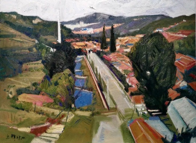 当我们凝视王辉的风景油画,扑面而来的并非某种明确的叙事或具体的景象,而是一种浑然一体的氛围,一种经由心灵过滤后重新编织的自然韵律。他以写生为舟楫,渡向自然与精神的彼岸,那些被他目光抚过的丘壑、港湾与街巷,从未止于物象的复刻,而是在色彩的交响与笔触的律动中,生长出独属于他的生命图景。