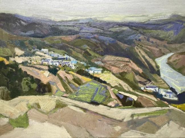他的画面,是色块与笔触共筑的秘境。当目光掠过苍莽的山原,黄褐色如泥土般厚重,赭红与灰紫似时光烙下的纹理,笔触顿挫如斧劈刀削,却在粗犷中藏着草木生长的细腻呼吸;而当海风漫过渔港,色彩骤然热烈,笔触如潮水奔涌,将天地瞬间的绚烂定格成永恒的韵脚。在这里,“写生”早已超越对景描摹,成了心与物的私语——每一抹色彩都是他与自然共振的心跳,每一道笔痕都是情绪流动的轨迹。