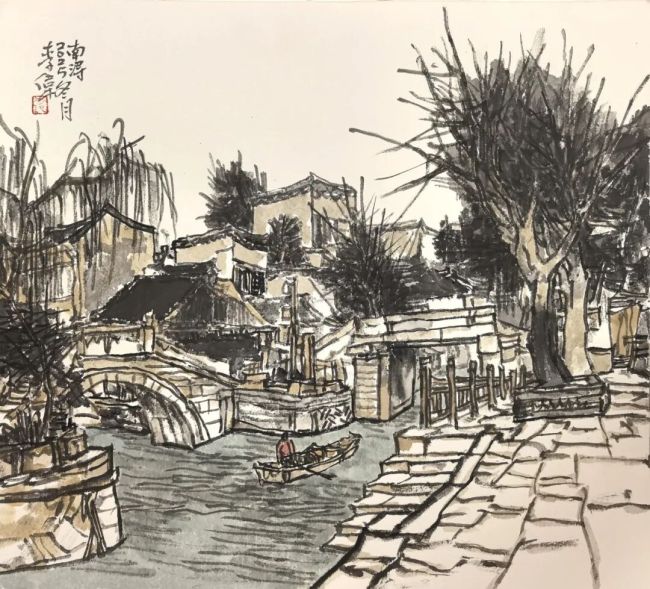 形制:写生纪实+传统书画框架既是对景写生的现场作品,又融入题款、印章等传统书画元素,让水乡的鲜活生活细节与文人画的审美形式自然衔接。