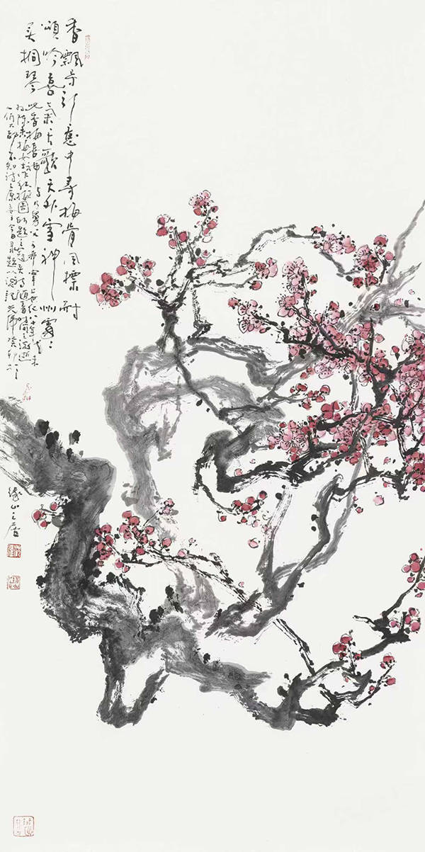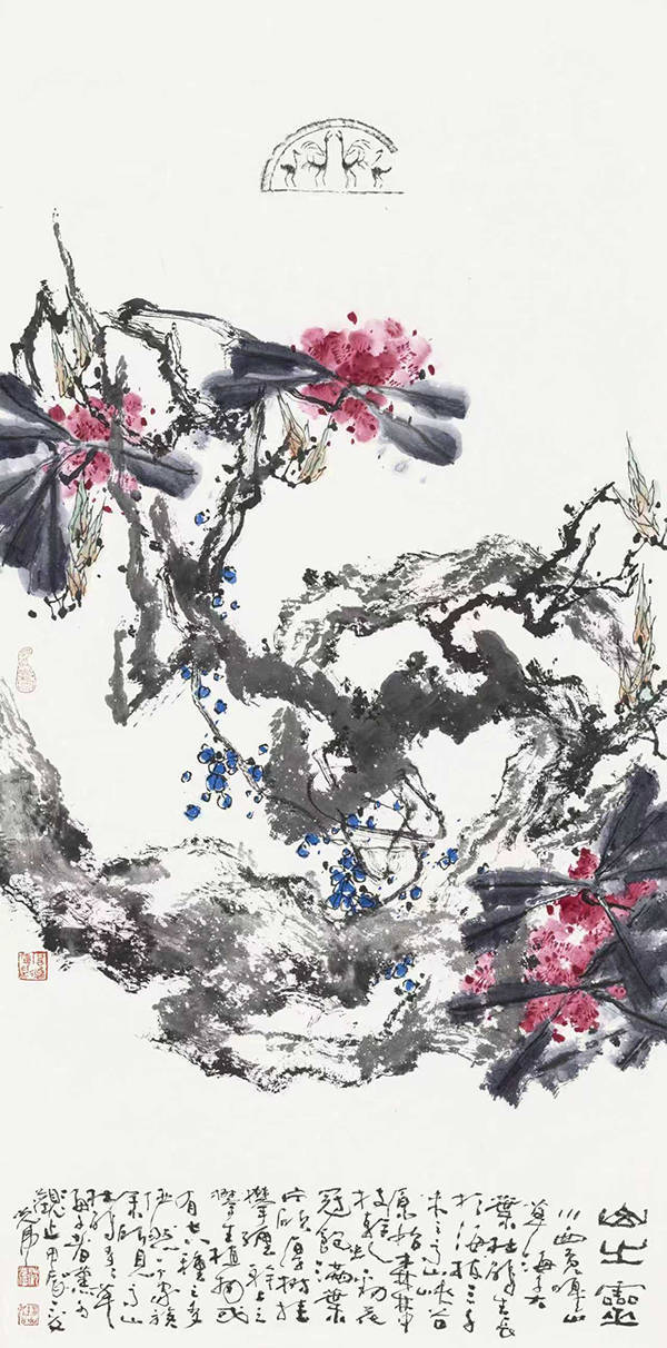 沈光伟的笔墨之魂,在于“骨力”的构建与“墨韵”的灵动,深度践行了“笔为骨”“骨法用笔”的传统精髓。沈光伟的笔墨首重“骨力”,他恪守中锋用笔之道,以篆书的沉厚稳健与狂草的灵动洒脱融入绘画线条,每一笔都饱含书法的韵律与力透纸背的力量——这种“骨力”并非刻意的刚硬,而是历经岁月沉淀与生命体悟的坚韧,恰是对近世画坛崇尚干笔枯墨、凝滞板涩之风的有力矫正。在其标志性的高山杜鹃系列作品中,绘画时他大笔泼墨奠定枝干的体量感,破墨分出明暗层次、丰富肌理,飞白线条勾勒皮层纹理,让枝干兼具“青铜铸骨”的厚重与龙蛇舞动的灵动,更以湿墨的淋漓酣畅分远近层次、显浓淡虚实,“湿墨”得其韵,“中锋”立其骨,温润与沧桑、氤氲与肯定间,共同构成了沈光伟笔墨语言的基石。他所画的高山杜鹃叶子,既非现实中的大小比例,也非自然中的真实形态,他将写生中所见“花开时叶片尽数低垂托举娇艳花朵”的细节融入创作,让笔墨不仅有骨力,更有温情,完成了对生命的诗意诠释。沈光伟将“湿墨”的氤氲化生与“中锋”的骨力结构完美结合,使画面既水墨酣畅淋漓,充满了呼吸感与韵律感,又结构严谨,凌乱中见和谐,参差中得律动,真正达到了“超逸”而不失法度、“有致”而气韵盎然的境界,恰是高山杜鹃在海拔二千米以上高寒环境中“向死而生”的生命韧性的直接写照——那些扭曲交错的枝干,不是自然形态的简单复制,而是沈光伟对生命在极端环境中坚守与抗争的精神提炼,再现高山杜鹃迎向天光的鲜活气象,这种将生命体验转化为笔墨张力的能力,正是沈光伟超越技法层面的高明之处,也践行了文人画“以书入画”的核心传统。如果说“骨力”是沈光伟笔墨的骨架,那么“墨韵”便是其血肉与灵魂,他突破传统范式,即便泼墨之作烟岚满纸,仍以书法笔墨为内在之骨,让画面兼具淋漓墨块与劲逸线条,将现代审美意识与西方实景写生经验融入墨色运用,让墨色成为传递情感、营造意境的重要语言,达到艺术语言的选择应与表达的内容高度契合,不仅是个性情感的抒发,更是对一种行将湮没的、代表健康饱满审美趣味的笔墨正脉,进行接续与光大。