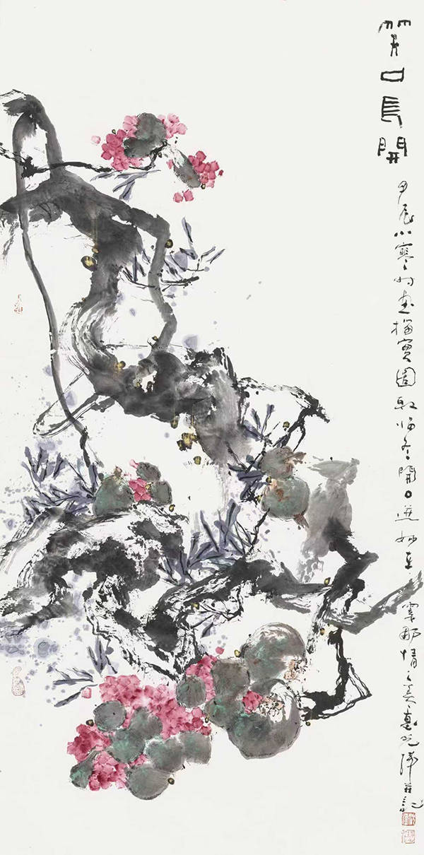 沈光伟的艺术突破,不仅体现在笔墨语言的创新,更在于他从徐渭、陈淳到恽南田等名家巨擘精研后,对大写意画发展脉络的精准把握,为传统写意花鸟的当代转化提供了清晰的学理支撑。他秉持以造型感把控空间占据与分割,以韵律感营造画面运动形式,以节奏感传递情感与视觉的直接表达,打破了传统写意花鸟创作中重经验、轻学理的局限,让笔墨创新有章可循、有理可依,体现了当代艺术家的理性思考,彰显了他注重作品的学理深度的艺术实践和理论自觉。由此,沈光伟的作品聚焦笔墨纵恣、气势磅礴的水墨大写意,相较于明初林良、吕纪等院体工笔重彩画,他的放笔纵墨朝向纵肆放逸的方向发展,更为关键的是,他延续并发展了文人画“以感情驾驭笔墨、以笔墨抒发感情”的传统,将写意画推向强烈抒写内心情感的新境界——其画风不求物象形似,而以简练概括的笔墨语言描绘意态神韵,这恰是大写意画的核心精髓,即师法造化,也远离“近取诸身,远取诸物”的形象约束,以符号化的多变点线在空间结构中靠动感抒发性情,成为对徐渭、陈淳、八大等写意典范的传承与发展。