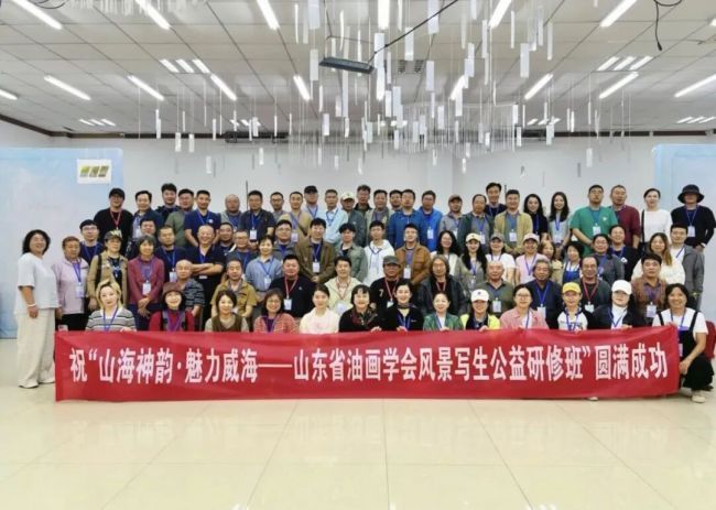 10月2日,山海神韵·魅力威海——山东省油画学会风景写生公益研修班(2025)开班仪式在威海荣成天鹅湾写生基地举行,来自全国九个省份的八十余名学员参加了活动。