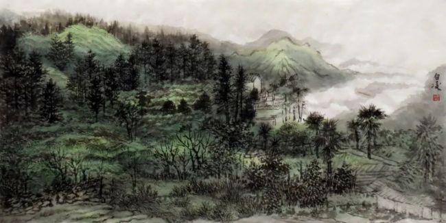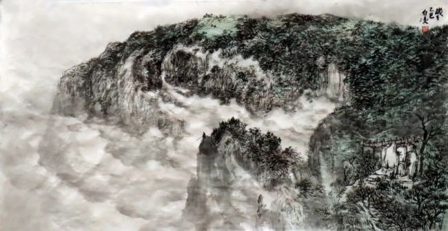 “烟云之虚”的空间构建持续的阴雨,赋予了莽山最具呼吸感的特质——烟云的流转。云气弥漫、升腾、聚散,它们并非静止的背景,而是参与塑造山体神态、构建画面空间的主导力量。在创作中,用淡墨层层渍染,形成朦胧变幻的层次,留白处乃是涌动的、湿润的空气与光;以湿笔破墨,使物像边缘化入朦胧。画面因云烟的“虚”而气息通达,因山石的“沉”而精神凝聚,在有无之间,构筑一个可供心神栖居的苍茫世界。这不仅仅是自然现象的记录,更是我对“虚实相生”这一中国美学核心观念的体悟与表达,在朦胧中寻求清晰的精神指向。