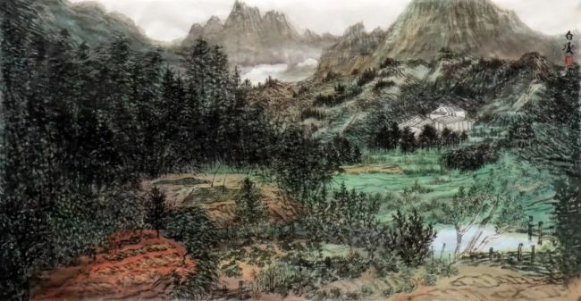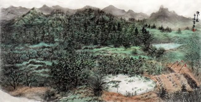 “田园之温”的意境生发山麓与谷地间,散落的村舍、层叠的梯田、蜿蜒的小径,在冬雨里别有一种温润的烟火气。雨幕如轻纱,使远处的屋宇轮廓柔和,近处的菜畦绿意盎然,墨色在此处趋于丰富,在水墨基调上施以花青、翠绿、淡赭、胭脂,雨中色调愈发清亮沉稳,使画面在清冷中透出暖意。这“田园”一角是整个莽山生命系统不可或缺的温暖注脚,是浸透着对日常劳作与栖居的深深敬意。田园之“润”,是雨泽万物、滋养生命的慈悲;其“苍”,则是这片土地上人们世代耕耘所积淀的、如同山石般沉默而深厚的历史质感。