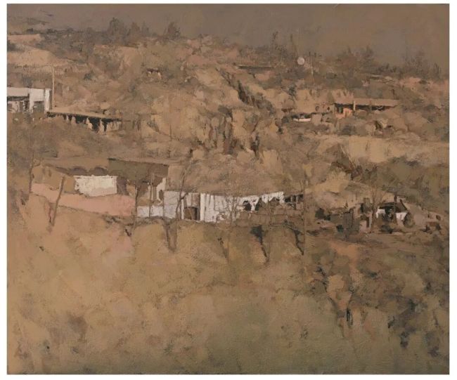 在艺术语言的营造上,宋延龙展现出精湛的把控能力。他偏爱以黄色、冷灰色等色调构建画面基调,色彩变化微妙而富有层次,形成张弛有度的视觉节奏。笔触激荡而不失细腻,跃动的点与颤动的线在画面中交织,既勾勒出景物的轮廓肌理,又传递出内在的情感韵律。构图简洁而富有张力,远景的迷蒙与近景的真切形成呼应,使画面在视觉上兼具纵深感与整体感,仿佛隔着一层时光的尘雾凝视故土,赋予作品浓郁的叙事感与氛围感。
