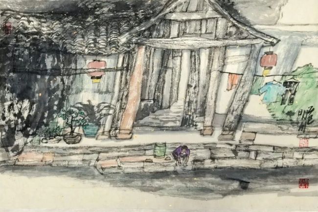 在线条运用上,画家将书法用笔转化为造型语言。垂柳藤枝桠如篆籀般盘曲,石桥栏杆似行草般飞动,船篷竹篙若楷书般端严。在《乌镇印象》中,他用细若游丝的线条勾勒出临水木窗的格纹,又以粗笔浓墨表现斑驳的砖墙肌理,刚柔相济的线条组合构建出充满韵律感的画面节奏,使静态的景物获得了动态的生命力。