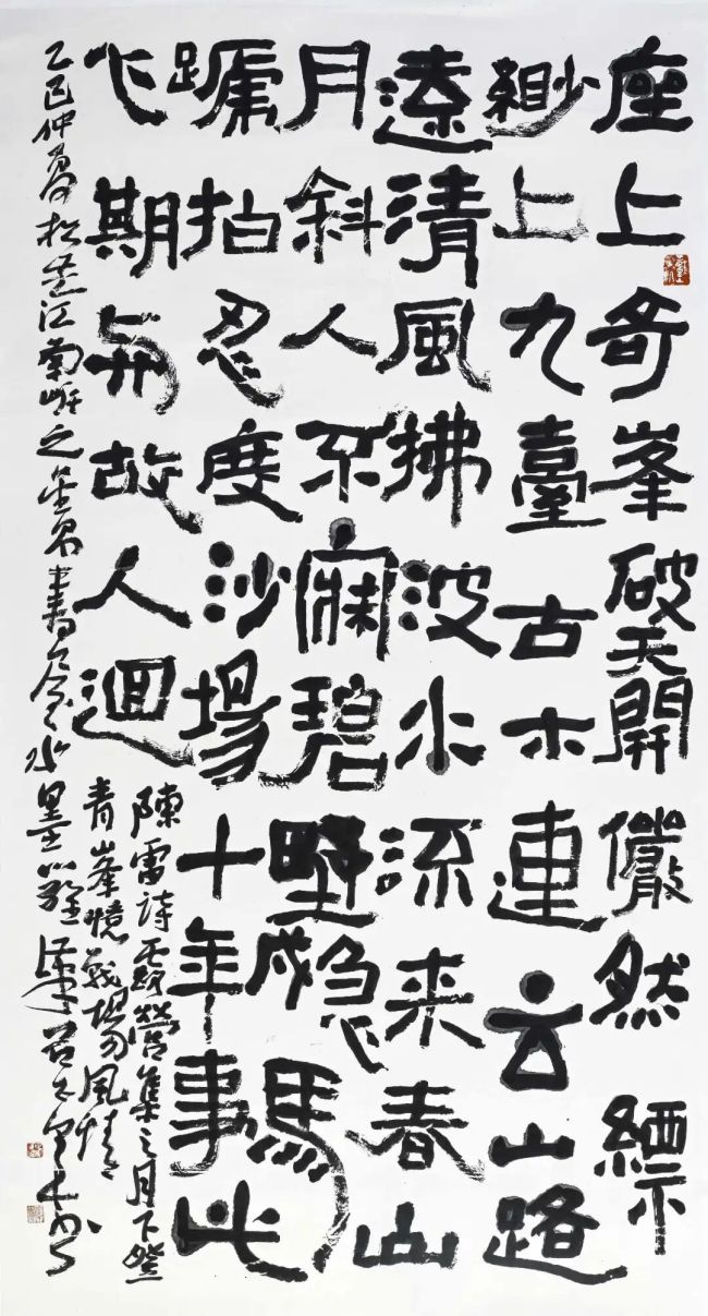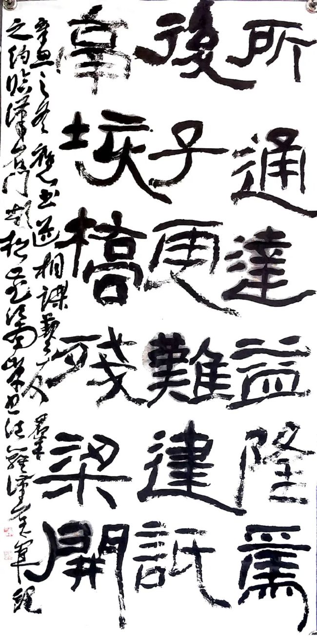 这种追求的实质,是将书法的“书写性”向“铭刻性”拓展。在他的笔下,线条的生成过程被赋予了新的意义——它不仅是毛笔在纸绢上流畅地行进,更是一种对“刻”的模拟与转化。观其《金石大篆》系列作品,每个字的笔画都仿佛经历了“书写-刻制-拓印”的多重转化:起笔处如钝刀切入石面,含蓄而坚定;行笔过程中笔锋的绞转与颤动,营造出类似刻痕边缘因石质肌理而产生的微妙崩裂与毛涩感;收笔时或戛然而止,或自然出锋,皆带有“刀意”而非单纯的“笔意”。墨色的运用也服务于这一质感追求,浓重的焦墨营造出青铜器深沉的底色,枯笔飞白则恰似拓片上因捶拓不均而形成的虚实变化,而局部宿墨的胀墨,又让人联想到铜锈的自然沁染。