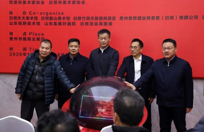 冬日曹州,翰墨飘香。为深入学习贯彻党的二十大及历次全会精神,坚定文化自信,繁荣新时代美术创作,1月10日,由山东省美术家协会提供学术支持,菏泽市文联、日照市文联、菏泽曹州书画院、菏泽市政协书画院、日照市政协书画联谊会、曲阜师范大学美术与书法学院、山东外国语职业技术大学联合主办,菏泽市美术家协会、日照市美术家协会共同承办,日照天大美术馆、日照那山美术馆、日照竹洞天旅游风景区、贵州贵邦酒业将香客(日照)有限公司、日照黄海之眼酒业有限公司、山东视野美术馆、山东集雅轩画院、日照浩远斋画廊协办的“道器共尊——李京波中国画作品展”在菏泽曹州书画院盛大启幕。本次展览是鲁南地区书画界践行文化“两创”、推动区域艺术交流的重要盛事。
