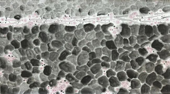 我觉得这样的场景,这样的诗意,在古人那儿已经很丰富了,那么它能够给我们带来一些什么样的联想呢?从画中寄托一些什么样的情感呢?再是强调一个关于主题与笔墨的关系,我以墨色为主,代表桃花的颜色,曙红。再是降低它的明度,红里带一点灰,好像会更雅致,带有一种抒情的感觉。对春天既是一种回忆,一种追寻,又像历史上文人雅士的诗文一样,有一种淡淡的惆怅。