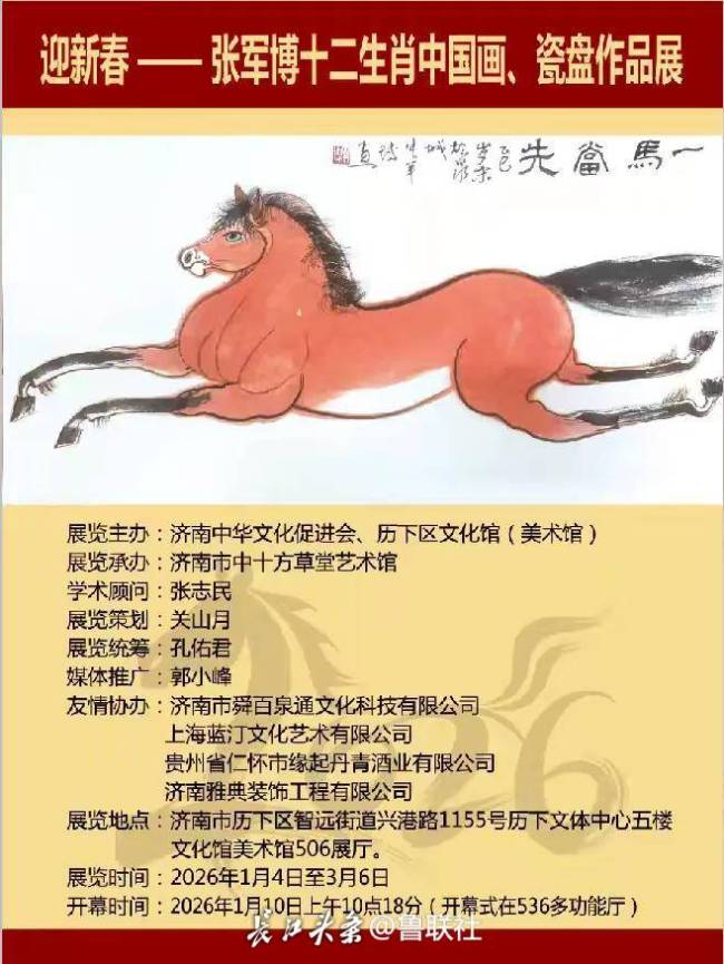 1月4日,由济南中华文化促进会、历下区文化馆(美术馆)主办,济南市十方草堂艺术馆承办的“迎新春——张军博十二生肖中国画、瓷盘作品展”在济南历下文体中心文化馆美术馆506展厅开展。