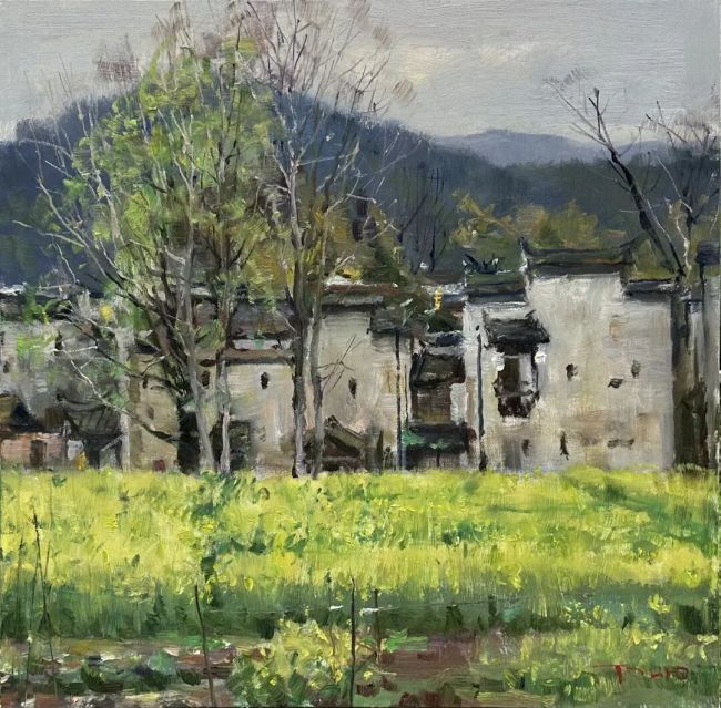 笔触是王铁牛风景油画的鲜明标识,厚重沉稳的笔触与细腻的肌理营造,赋予画面强烈的质感与生命力。他偏爱以厚涂的颜料堆积形成粗粝的画面表层,仿佛能触摸到土地的质朴与山川的肌理,这种笔触并非随意挥洒,而是如雕刻般精准贴合物象结构,时而沉稳缓慢,时而灵动流转,形成富有节奏的画面律动,暗含东方山水“骨法用笔”的韵味。通过笔触的层次叠加,他巧妙塑造出空间的纵深感,近景的细腻刻画与远景的朦胧晕染相互呼应,让画面既具写实的严谨,又有写意的空灵。