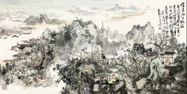 “泰山系列”“黄山系列”“三峡系列”中,古典笔墨的韵味、现代审美的气息与写生的真切感悟交织,营造出开阔苍茫、豁达洒脱的境界,《云山深处几人家》便是代表,山川朴茂、云气苍茫,小桥民居点缀其间,尽显画家驾驭自然物象的宽广胸襟。