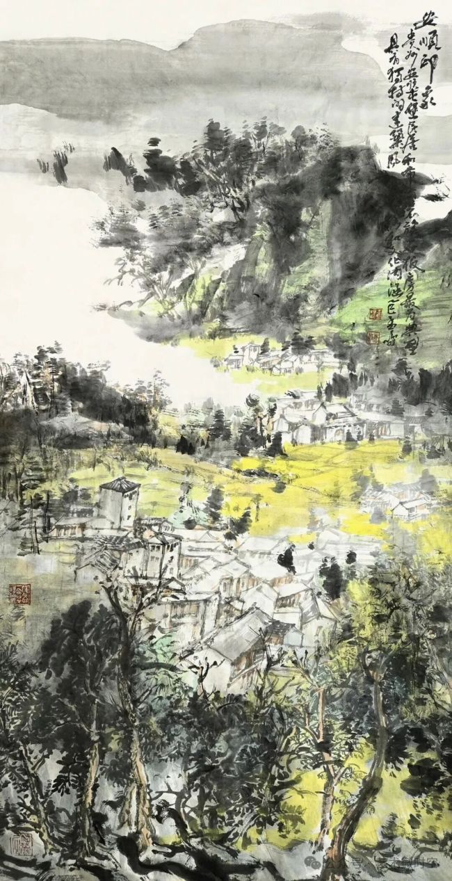 《茅屋深处话老庄》里,山林幽翠、山路曲径、山村幽静,整幅画透着澄明幽静之气,引人暂忘俗世繁杂,生出遁入桃源之想;《桃源深处》更将这份意境推向极致,近景苍古树冠上的鸟巢添加了诗趣,中景参差的古民居彰显了古意,远景苍茫的云天拓展了辽阔,让人仿佛踏入陶渊明笔下的世外之境;《水清风高几人家》《禅心尽入空无迹》则融禅意于笔墨,逸气与文韵交织,引人身心陶醉、神游其间。