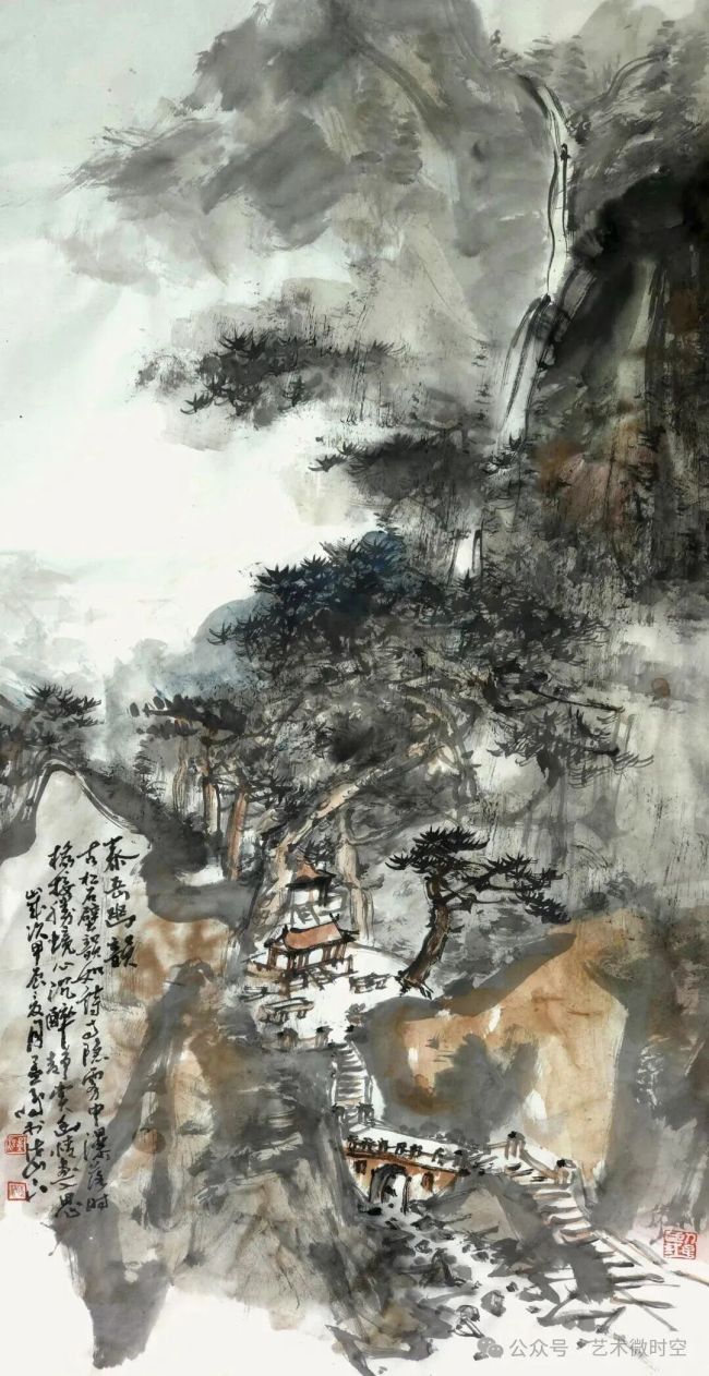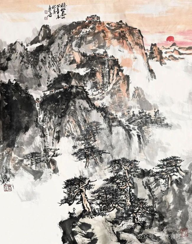 《紫气东来》堪称孟鸣哲思与笔墨结合的巅峰之作。他以重墨重彩营构泰山的巍峨雄壮,用苍劲笔法勾勒青松的苍古朴茂,借留白绘出瀑布如玉龙腾跃的啸天之势,再以细笔勾勒山门、寺观、民居、小桥,为雄浑山水注入生活气息与蓬勃生机;十八盘的高险入云、日出云海的壮丽瞬间,进一步强化了画面的磅礴气韵。而“紫气东来”的题款,既关联老子出关的典故,让人联想到泰山文化的厚重、中华文明的悠久,更传递出祥瑞之气,唤起观者对民族承先继后、繁荣鼎盛的信心。
