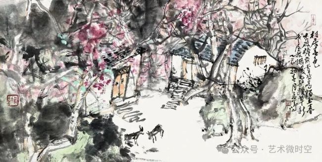 “泰山系列”“黄山系列”“三峡系列”中,古典笔墨的韵味、现代审美的气息与写生的真切感悟交织,营造出开阔苍茫、豁达洒脱的境界,《云山深处几人家》便是代表,山川朴茂、云气苍茫,小桥民居点缀其间,尽显画家驾驭自然物象的宽广胸襟。