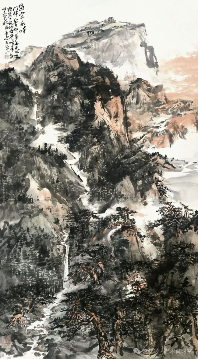 扎实的艺术根基,是孟鸣山水气韵充沛的底气。他早年沉心临摹古代名画,从“笔临”到“意临”,将宋元山水的笔墨精髓与文化精神内化于心;而后又追随名师遍历祖国名山大川,泰山的雄、黄山的奇、三峡的险,皆成为他写生本上的鲜活素材,为创作埋下无数灵感火种。这份“师古人”与“师自然”的积累,最终熔铸为他独特的艺术语言——以雄浑简练的笔墨绘奇峰陡立,让山石在柔婉线条中透出千钧之力;用丰富笔法墨法勾勒草木泉瀑,使画面既显大山大水的壮美,又藏细腻生动的意趣。