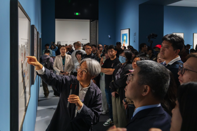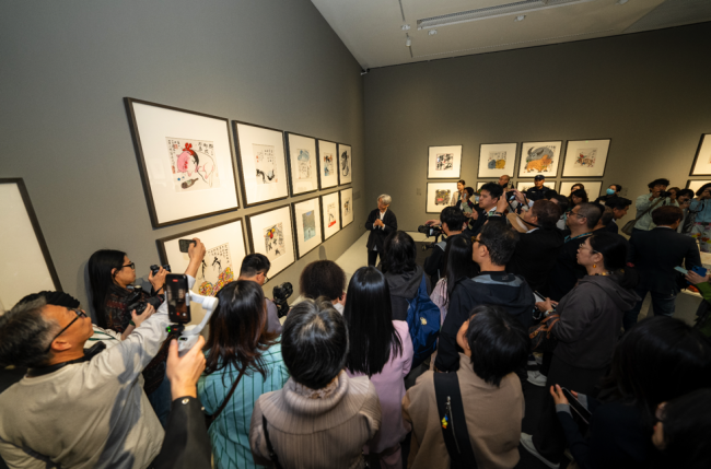 随后,吴洪亮为观众和媒体进行的导览,不仅勾勒出黄永玉90岁后的创作脉络,更揭示了一位世纪艺术家的精神世界。他指出,这次展览并非艺术家的回顾展,而是艺术家在九旬之后以全新心力完成的作品的一次集中呈现。其中,《煞风景》《李时珍先生随想》《宋元君到底想画啥图》等作品都给人强烈的惊喜与震撼,展现了黄永玉持续不减的创作激情。