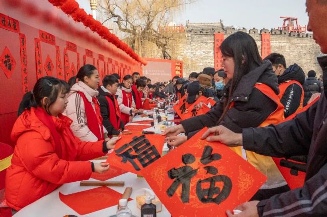 中国书协、山东省书协、济宁市书协、曲阜市书协四级协会的40名书法家与10名优秀青少年书法作者共同挥毫泼墨,为群众书写春联和“福”字。红纸墨香间,书家们以笔墨传递祝福,群众热情参与、有序领取,场面温馨热烈。