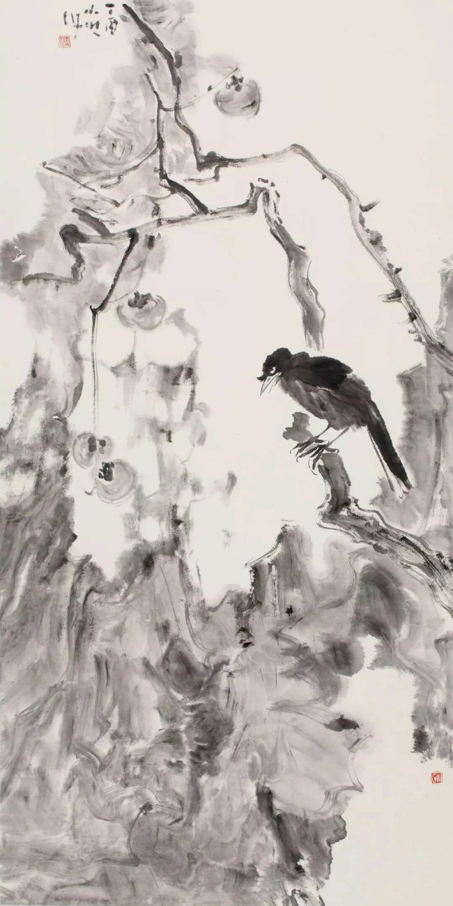 由这充满逸气的笔墨生发开去,潘小明构建了一个极具个人标识的视觉空间。在他的花鸟世界中,物象的物理结构往往被一种诗意的主观秩序所调和、所重组。他善于运用水与墨的天然氤氲,营造出“虚淡”而深邃的背景氛围。这种“虚”并非空洞无物,而是气息流转的通道,是无限遐想的生发地。墨色在水分的推动下自由渗化,形成朦胧变幻、层次丰富的肌理,仿佛晨雾弥漫的林间,又似月色笼罩的池塘,赋予画面一种梦境般的静谧感。花鸟形象便安置于这般虚灵的背景之上,它们的存在状态,往往是“灵转飘逸”的。枝叶的穿插掩映,禽鸟的栖止飞动,似乎并不完全遵循现实的生长逻辑或运动轨迹,而是依循着画面内在的气韵脉络与节奏需要,进行着一种精妙的安排。这种安排,使得有限的四尺平面,顿时获得了空间的延展性与时间的流动性,观者视线随着笔墨的引导在虚实之间游走,仿佛能穿透纸背,感受到画面之外更为广袤的无际空间。